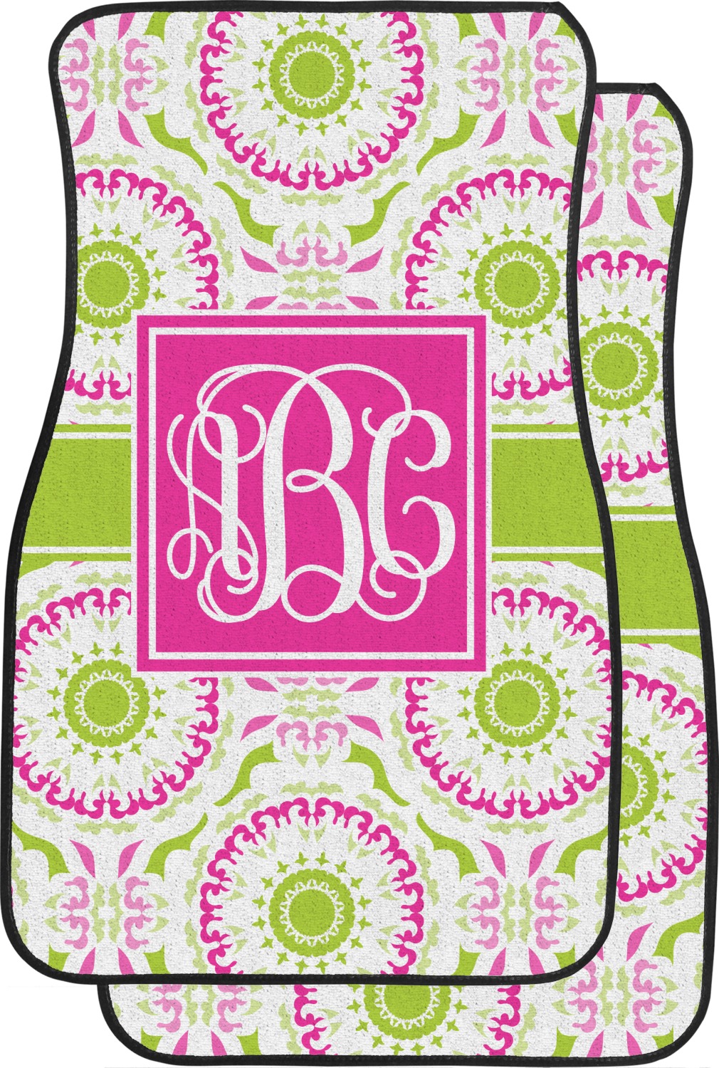 This design has a beautiful suzani floral pattern for the background. The colors in the background are white, hot pink, and lime green. These colors look super cute together. There is a lime green ribbon with a hot pink frame on top. Inside the frame is where your personalization goes. Put text or your initials for a monogram.