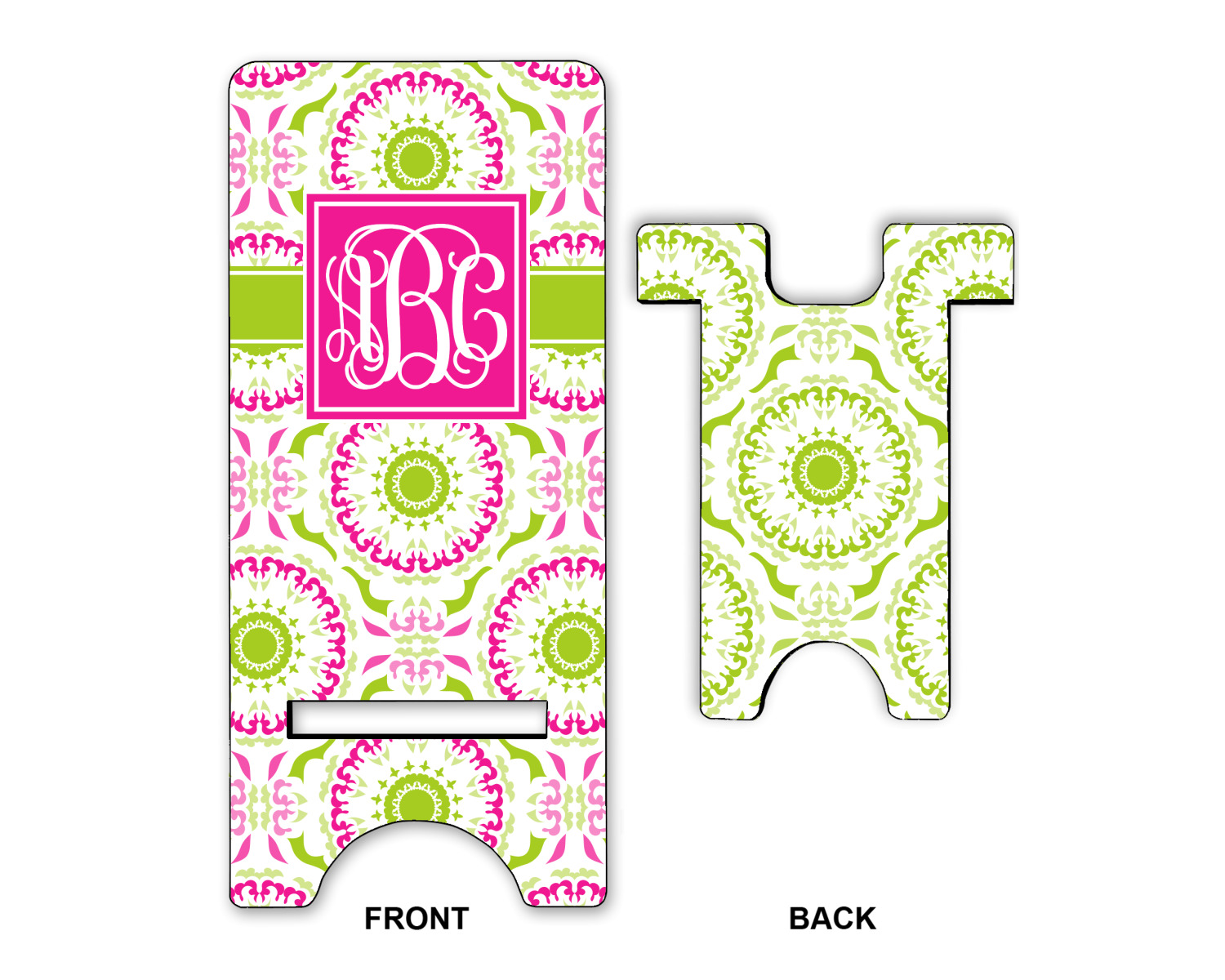 This design has a beautiful suzani floral pattern for the background. The colors in the background are white, hot pink, and lime green. These colors look super cute together. There is a lime green ribbon with a hot pink frame on top. Inside the frame is where your personalization goes. Put text or your initials for a monogram.