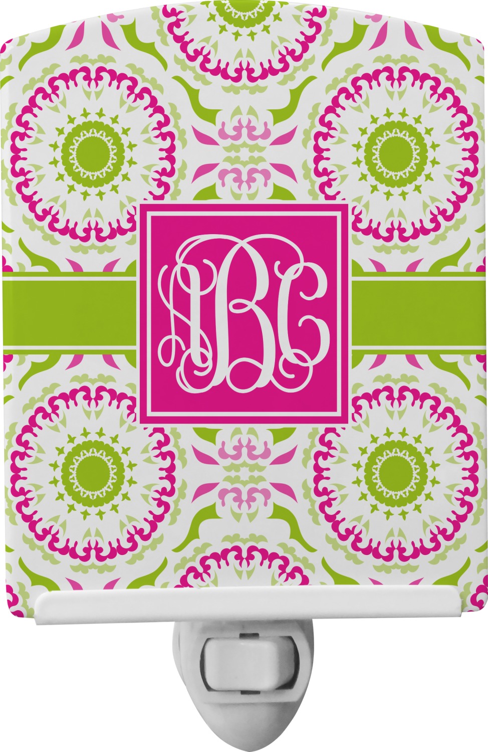 This design has a beautiful suzani floral pattern for the background. The colors in the background are white, hot pink, and lime green. These colors look super cute together. There is a lime green ribbon with a hot pink frame on top. Inside the frame is where your personalization goes. Put text or your initials for a monogram.