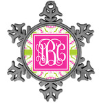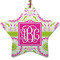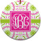 This design has a beautiful suzani floral pattern for the background. The colors in the background are white, hot pink, and lime green. These colors look super cute together. There is a lime green ribbon with a hot pink frame on top. Inside the frame is where your personalization goes. Put text or your initials for a monogram.