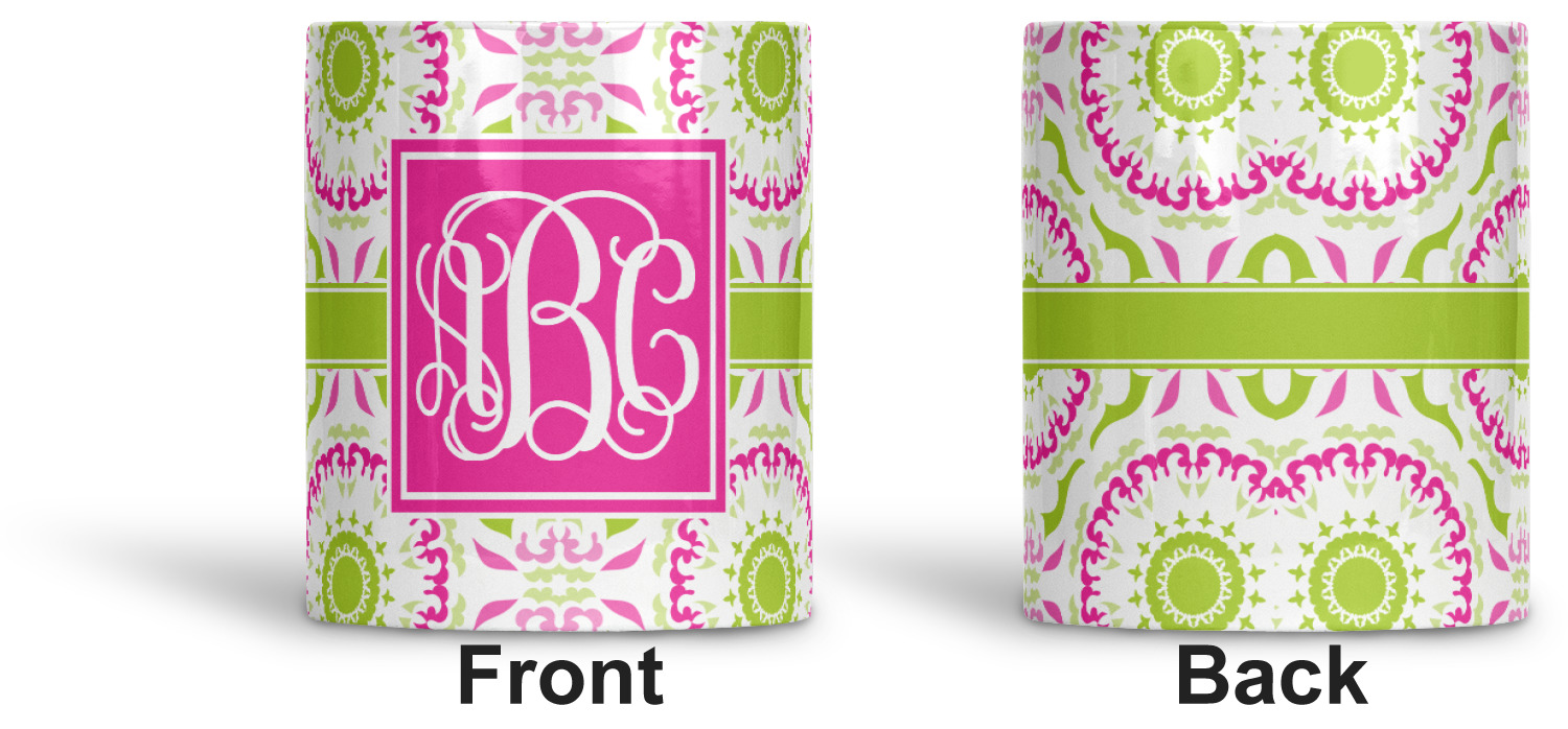 This design has a beautiful suzani floral pattern for the background. The colors in the background are white, hot pink, and lime green. These colors look super cute together. There is a lime green ribbon with a hot pink frame on top. Inside the frame is where your personalization goes. Put text or your initials for a monogram.