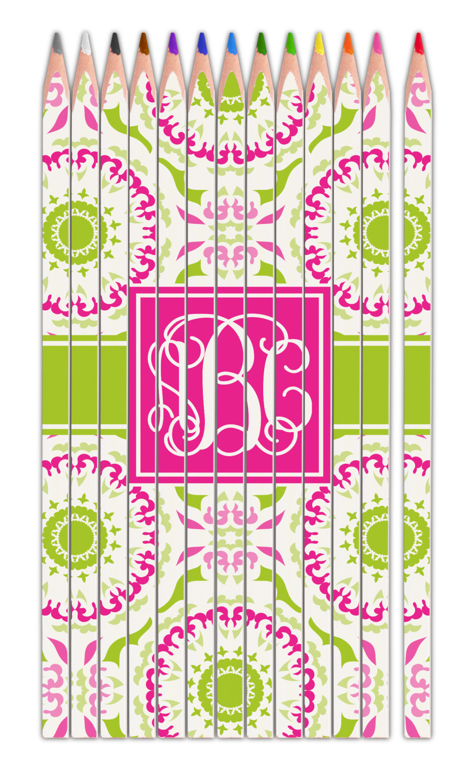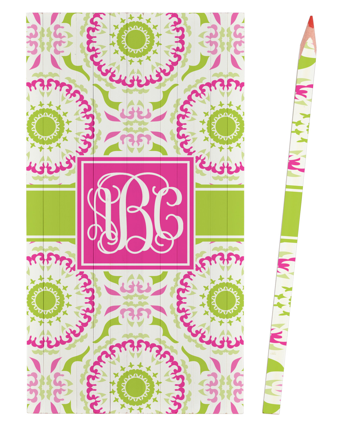 This design has a beautiful suzani floral pattern for the background. The colors in the background are white, hot pink, and lime green. These colors look super cute together. There is a lime green ribbon with a hot pink frame on top. Inside the frame is where your personalization goes. Put text or your initials for a monogram.