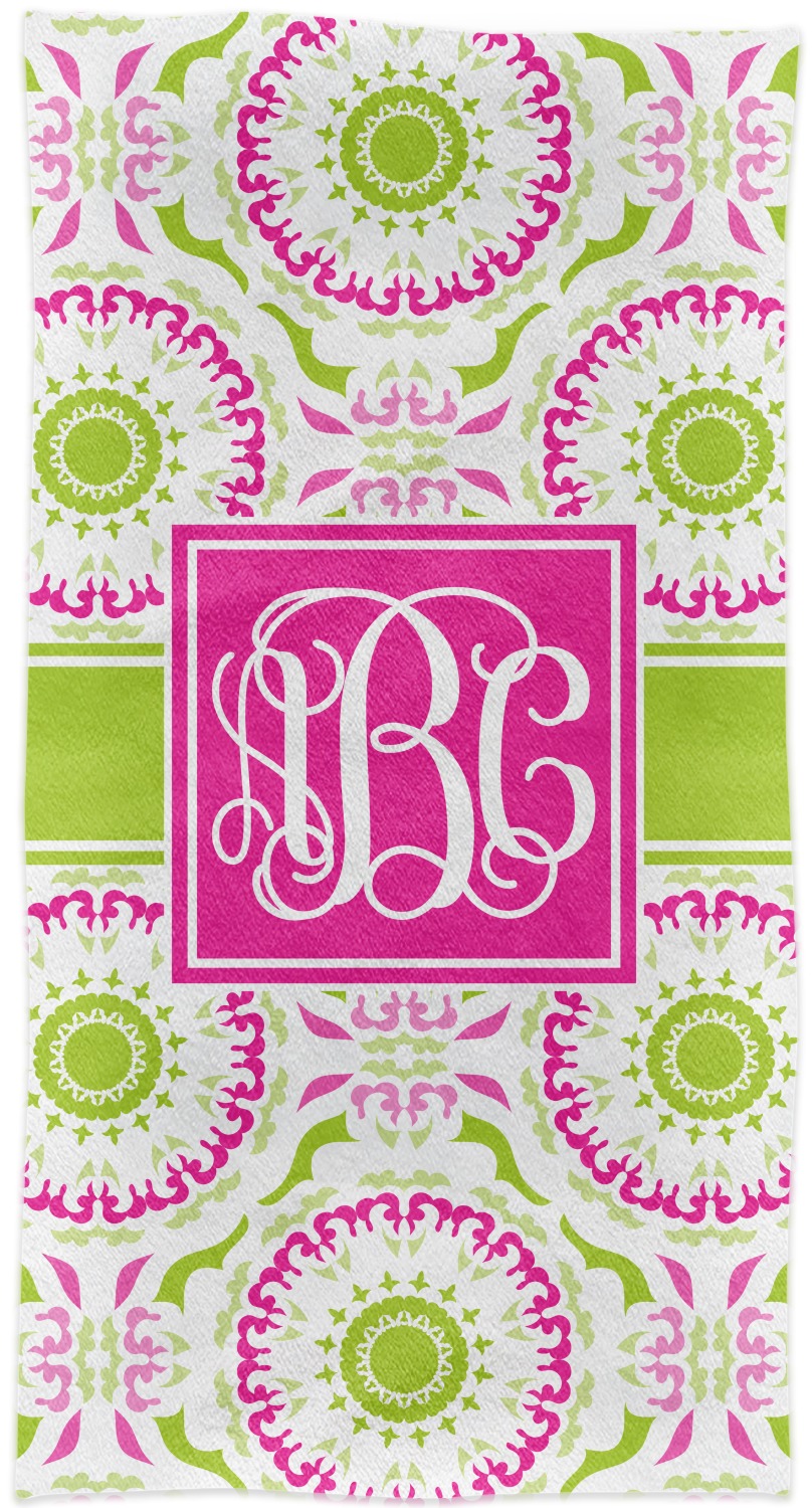 This design has a beautiful suzani floral pattern for the background. The colors in the background are white, hot pink, and lime green. These colors look super cute together. There is a lime green ribbon with a hot pink frame on top. Inside the frame is where your personalization goes. Put text or your initials for a monogram.