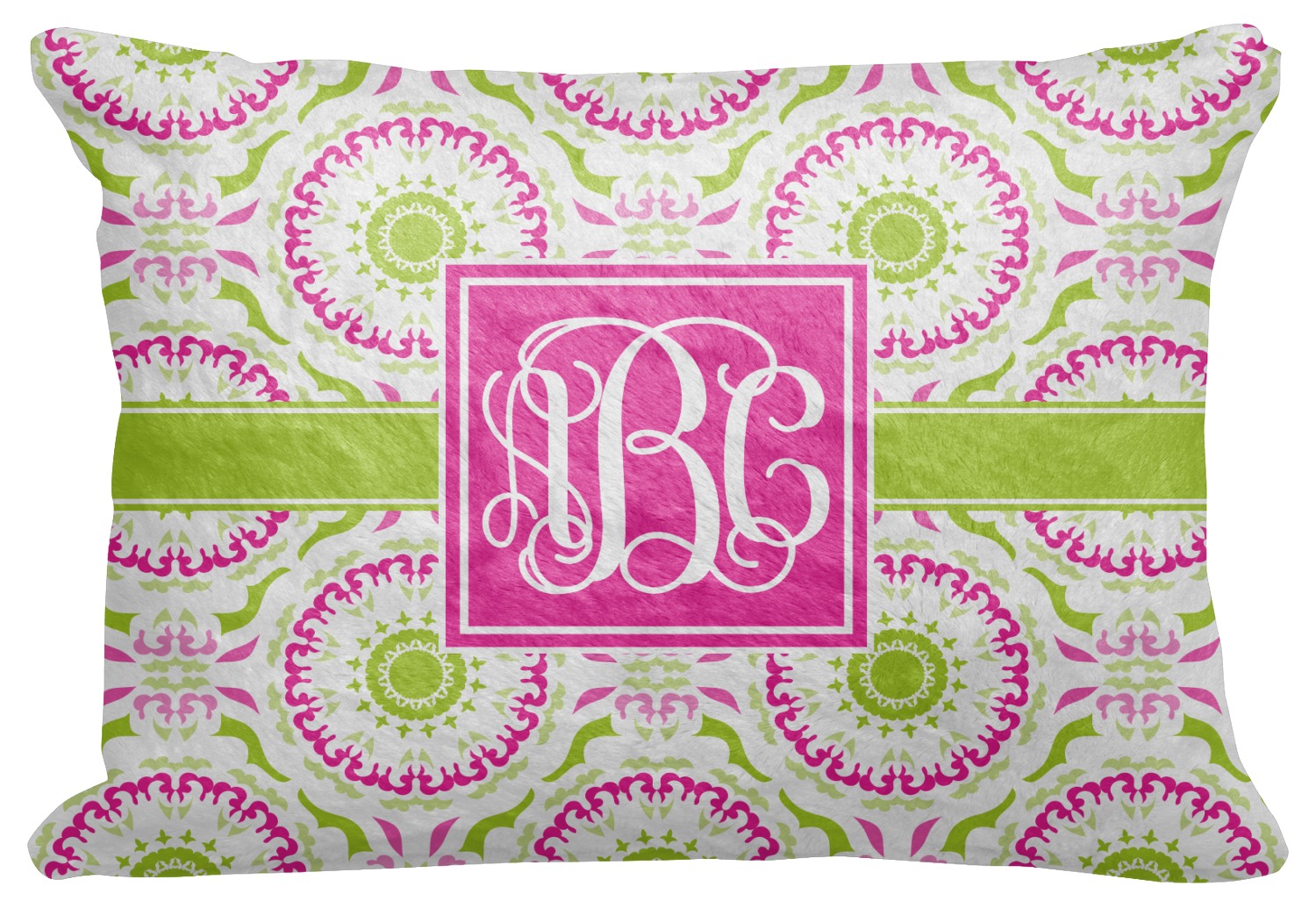 This design has a beautiful suzani floral pattern for the background. The colors in the background are white, hot pink, and lime green. These colors look super cute together. There is a lime green ribbon with a hot pink frame on top. Inside the frame is where your personalization goes. Put text or your initials for a monogram.