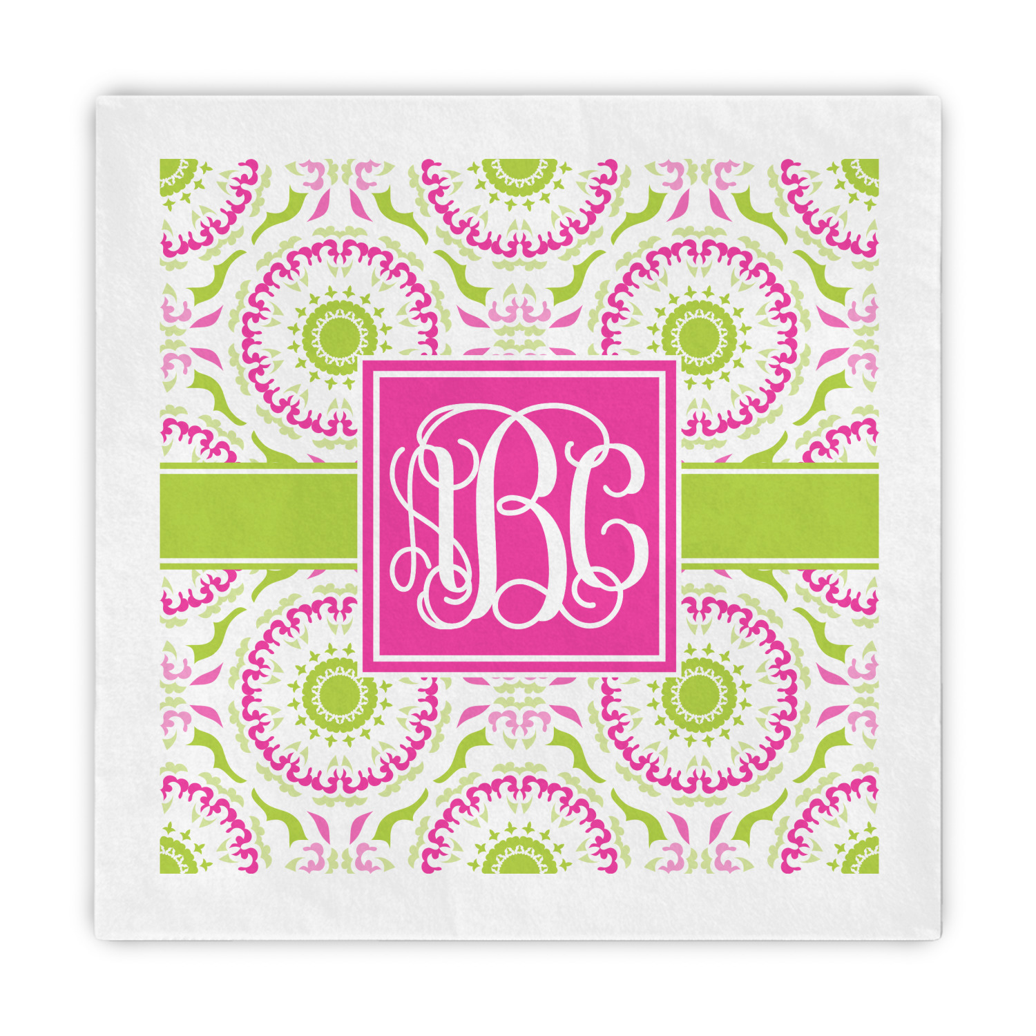 This design has a beautiful suzani floral pattern for the background. The colors in the background are white, hot pink, and lime green. These colors look super cute together. There is a lime green ribbon with a hot pink frame on top. Inside the frame is where your personalization goes. Put text or your initials for a monogram.