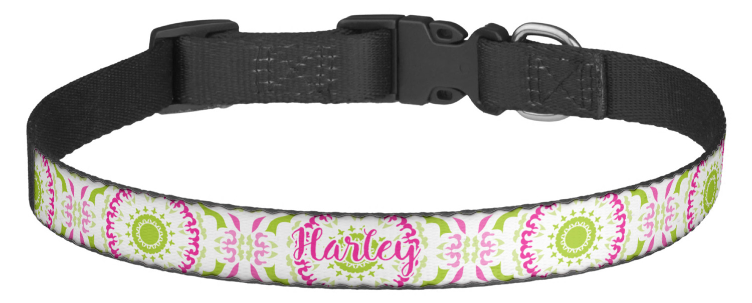 This sturdy collar, made from a durable nylon weave, will outlive your dog's episodes of excited tugging and pulling. Courtesy of its thick plastic buckle and adjuster, this collar is adjustable and accommodating of any dog. Structurally, the collar is a single piece of nylon weave that is sewn together, and features a solid metal loop where you can attach a leash or dog tag. We print and display your dog's name and pattern across the middle of the personalized dog collar.
