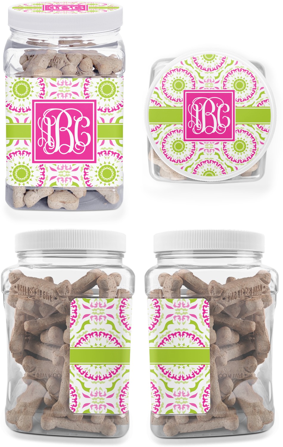 This half gallon jar, made from a sturdy plastic, is the perfect way to keep treats from any naughty pet paws, while still keeping them ready on hand for when your pup performs an impressive trick. This dog cookie jar features a screw-on, white lid that displays your personalized design on a vinyl sticker. We apply another customized sticker that wraps around the front and sides of the jar. Our dog treat jar also has indentations on the rear ends of the sides, which allows for convenient handling, and its square frame allows for easy storage.
