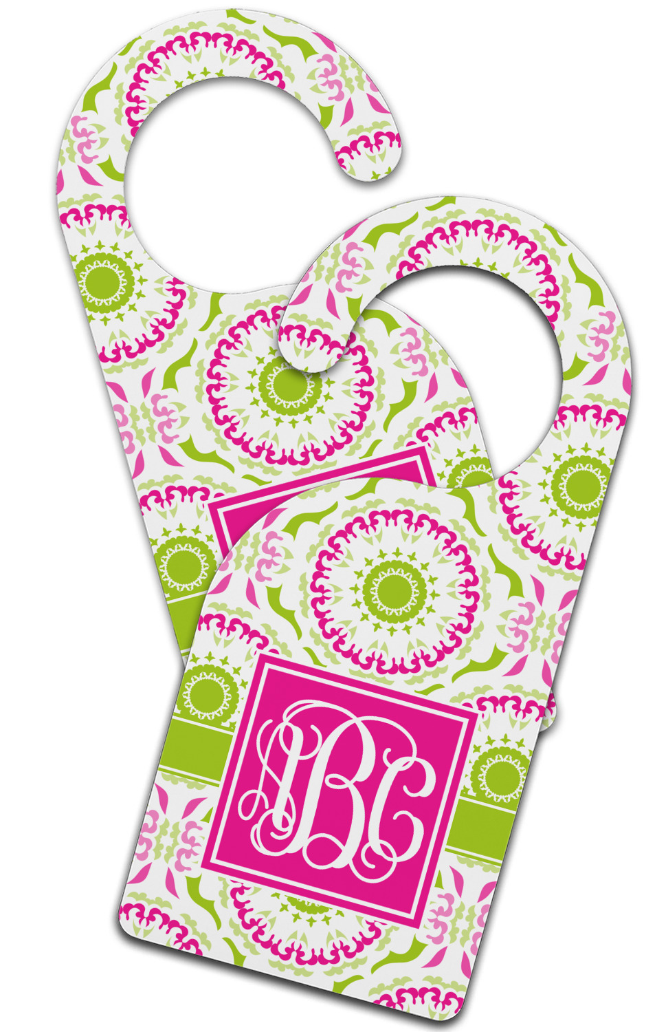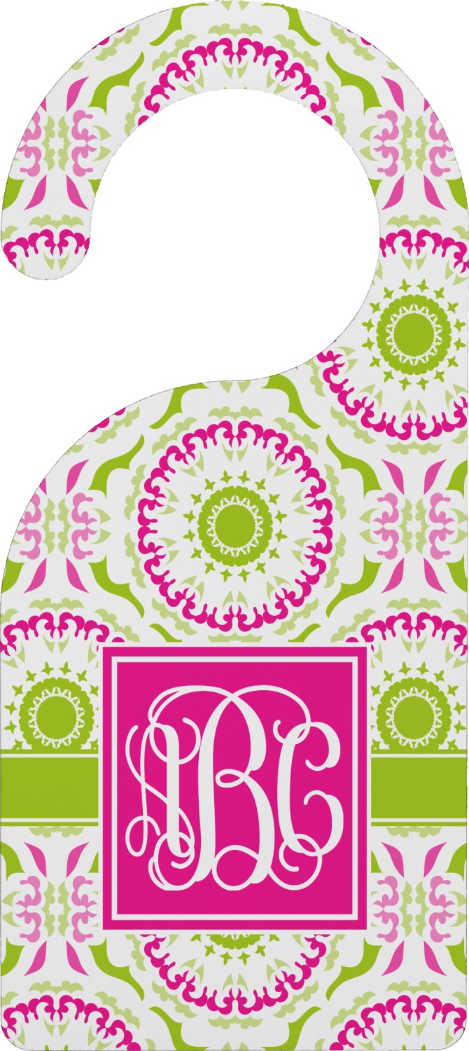 This design has a beautiful suzani floral pattern for the background. The colors in the background are white, hot pink, and lime green. These colors look super cute together. There is a lime green ribbon with a hot pink frame on top. Inside the frame is where your personalization goes. Put text or your initials for a monogram.