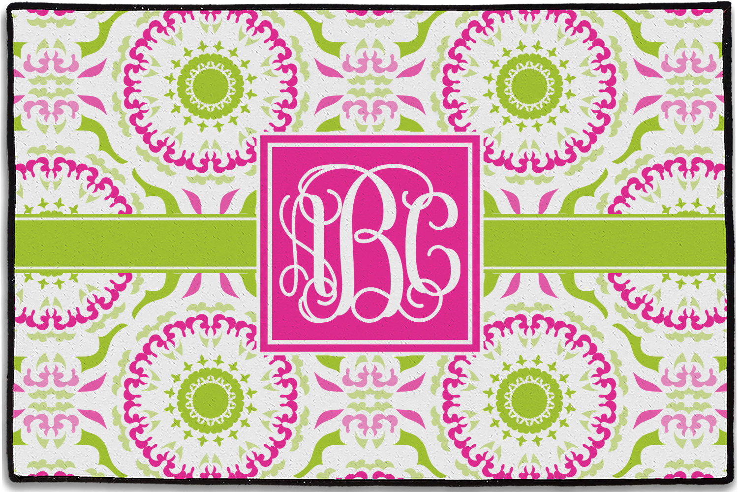 This design has a beautiful suzani floral pattern for the background. The colors in the background are white, hot pink, and lime green. These colors look super cute together. There is a lime green ribbon with a hot pink frame on top. Inside the frame is where your personalization goes. Put text or your initials for a monogram.