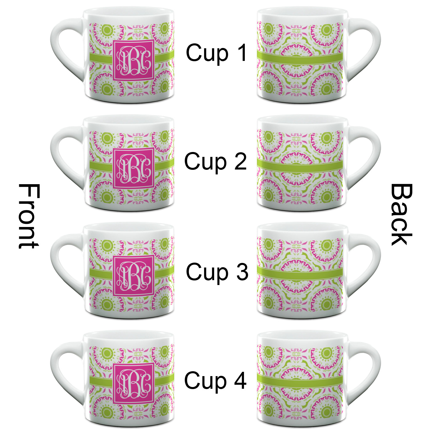 Each of our espresso mugs is a ceramic material sure to keep your drink warm. Personalize one cup for yourself, or order a set of 4! Its the perfect little gift for any coffee lover! We carry two sizes for you to personalize - 3 oz. (approx. 3.25" x 2.325" x 2.625") or 6 oz. (approx. 4" x 2.9" x 2.9"). Our 3 oz. mug is perfect for that single shot espresso while our 6 oz. mug can be your next favorite cappuccino cup holding two shots of espresso!