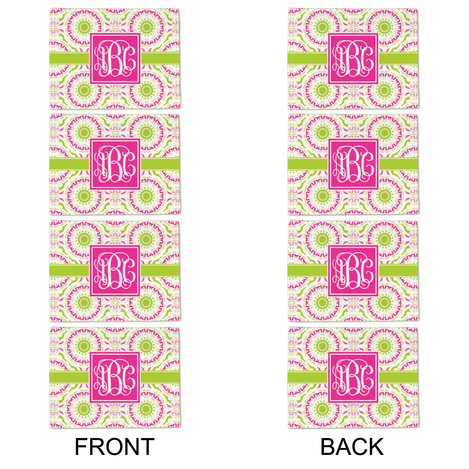 This design has a beautiful suzani floral pattern for the background. The colors in the background are white, hot pink, and lime green. These colors look super cute together. There is a lime green ribbon with a hot pink frame on top. Inside the frame is where your personalization goes. Put text or your initials for a monogram.