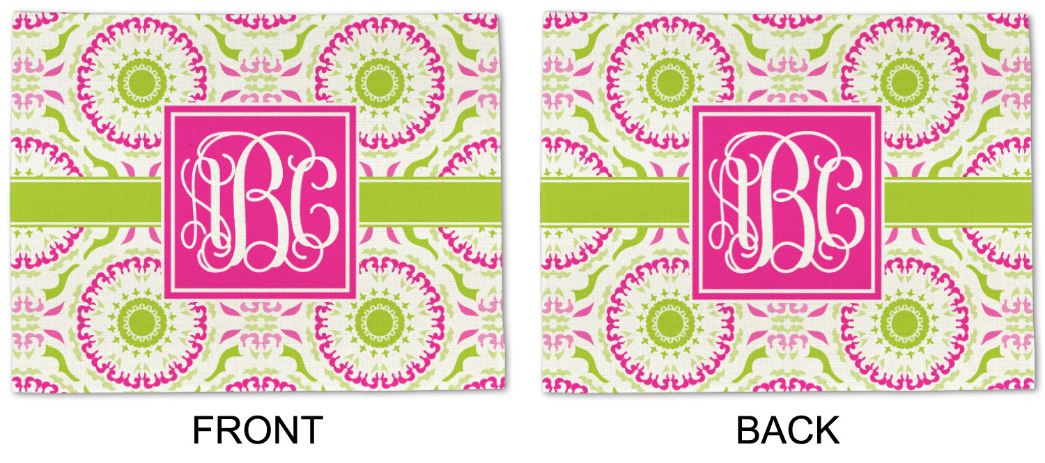 This design has a beautiful suzani floral pattern for the background. The colors in the background are white, hot pink, and lime green. These colors look super cute together. There is a lime green ribbon with a hot pink frame on top. Inside the frame is where your personalization goes. Put text or your initials for a monogram.