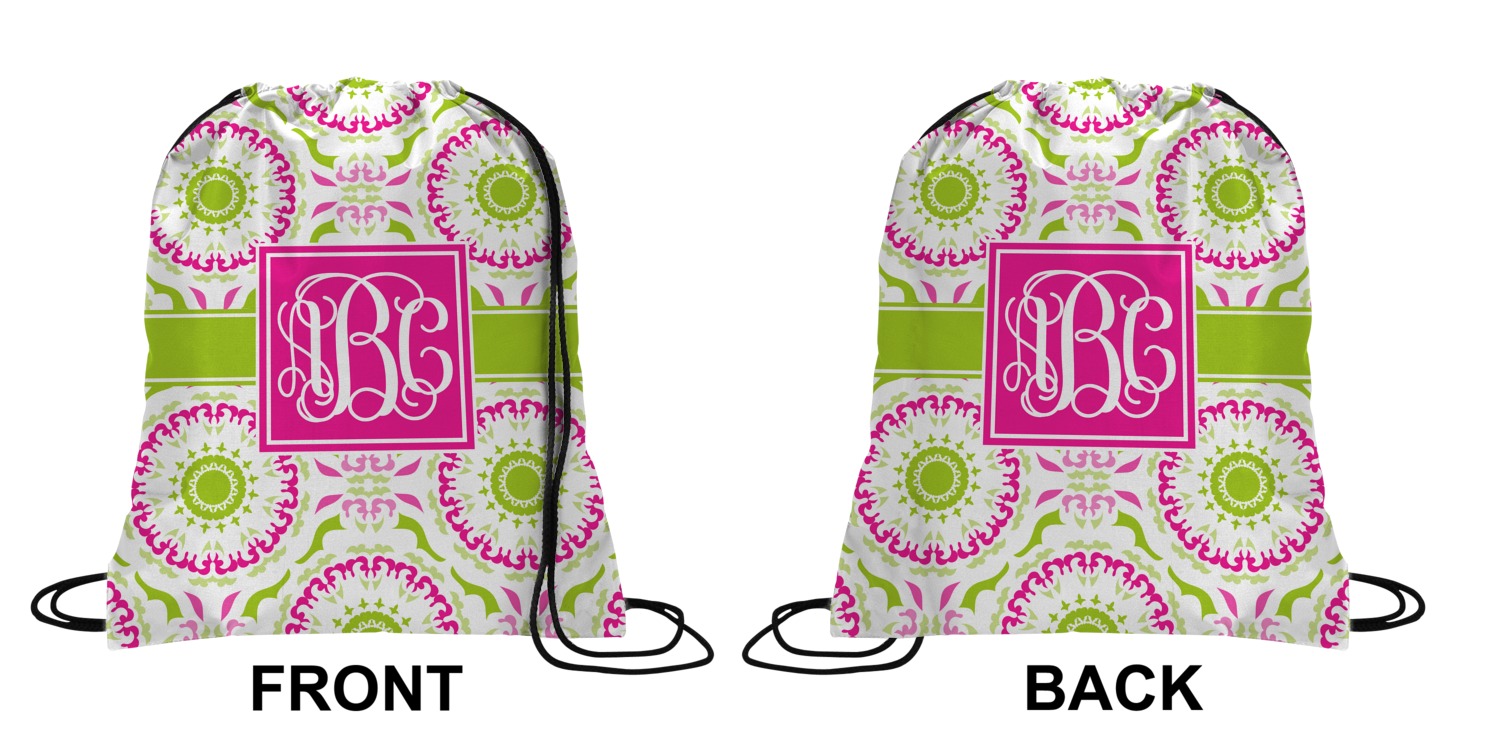 Our drawstring backpacks are custom made for you here in the USA. We offer a great selection of cinch bags and it is your choice to personalize them with the text of your choice, in the format of your choice i.e. monogram, name, initial, name & initial. We offer many different patterns and prints; and many of the patterns are available in 45 different colors.