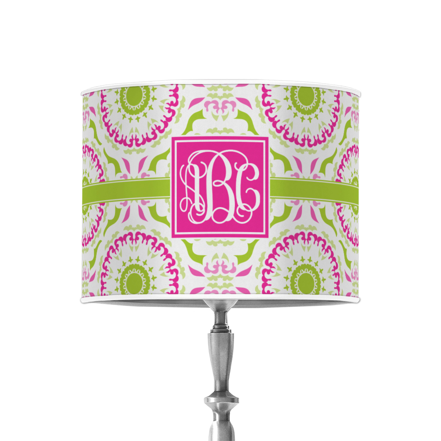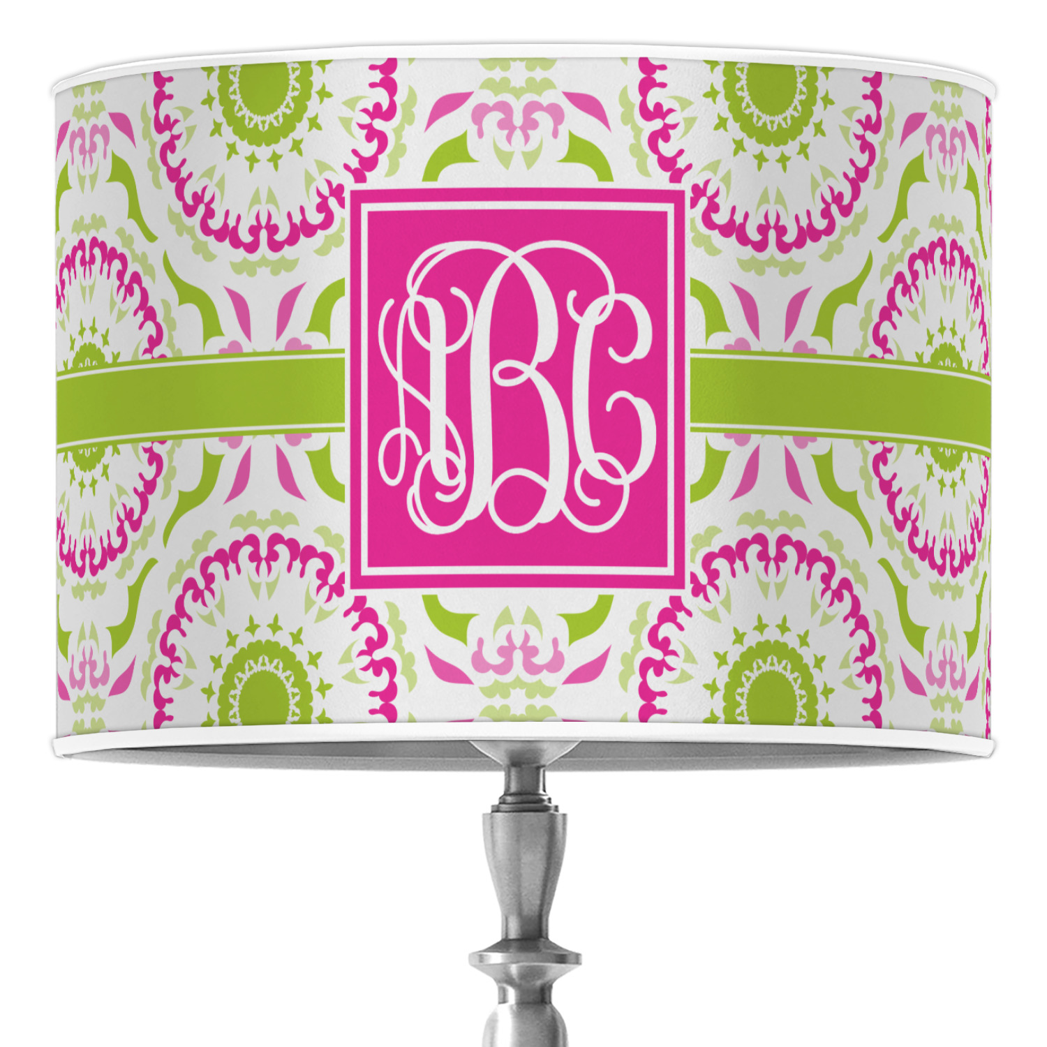 This design has a beautiful suzani floral pattern for the background. The colors in the background are white, hot pink, and lime green. These colors look super cute together. There is a lime green ribbon with a hot pink frame on top. Inside the frame is where your personalization goes. Put text or your initials for a monogram.