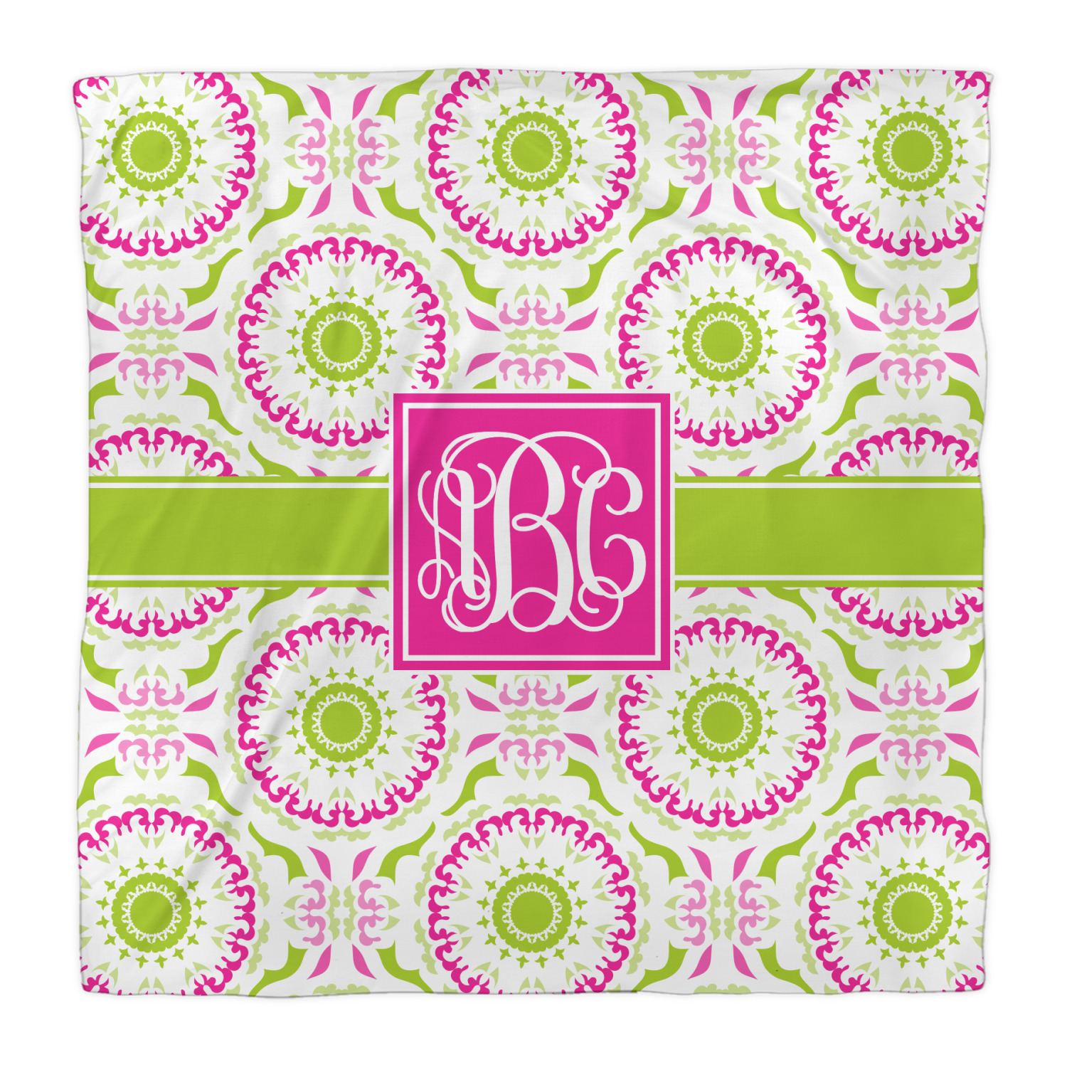 This design has a beautiful suzani floral pattern for the background. The colors in the background are white, hot pink, and lime green. These colors look super cute together. There is a lime green ribbon with a hot pink frame on top. Inside the frame is where your personalization goes. Put text or your initials for a monogram.