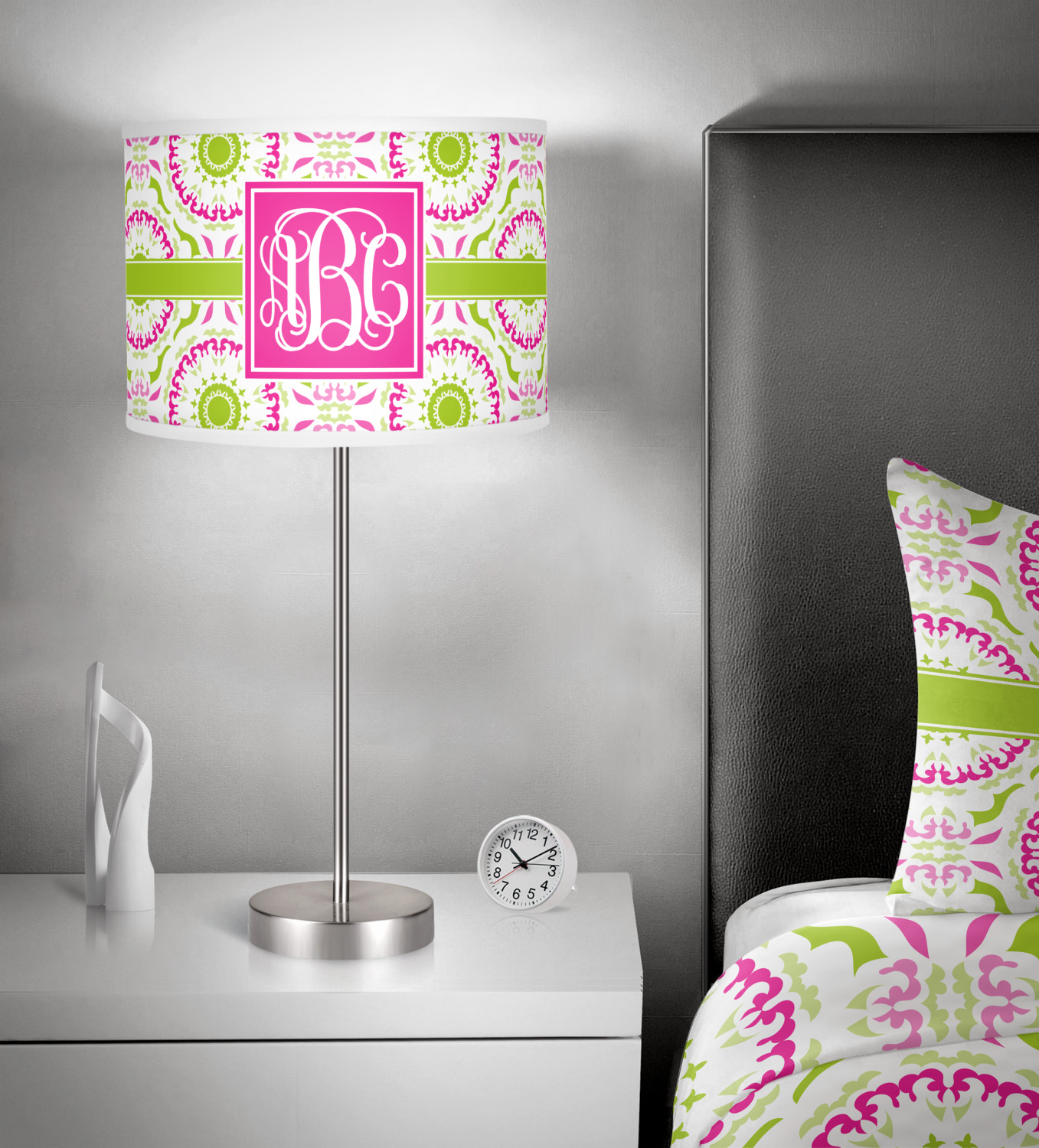 This design has a beautiful suzani floral pattern for the background. The colors in the background are white, hot pink, and lime green. These colors look super cute together. There is a lime green ribbon with a hot pink frame on top. Inside the frame is where your personalization goes. Put text or your initials for a monogram.