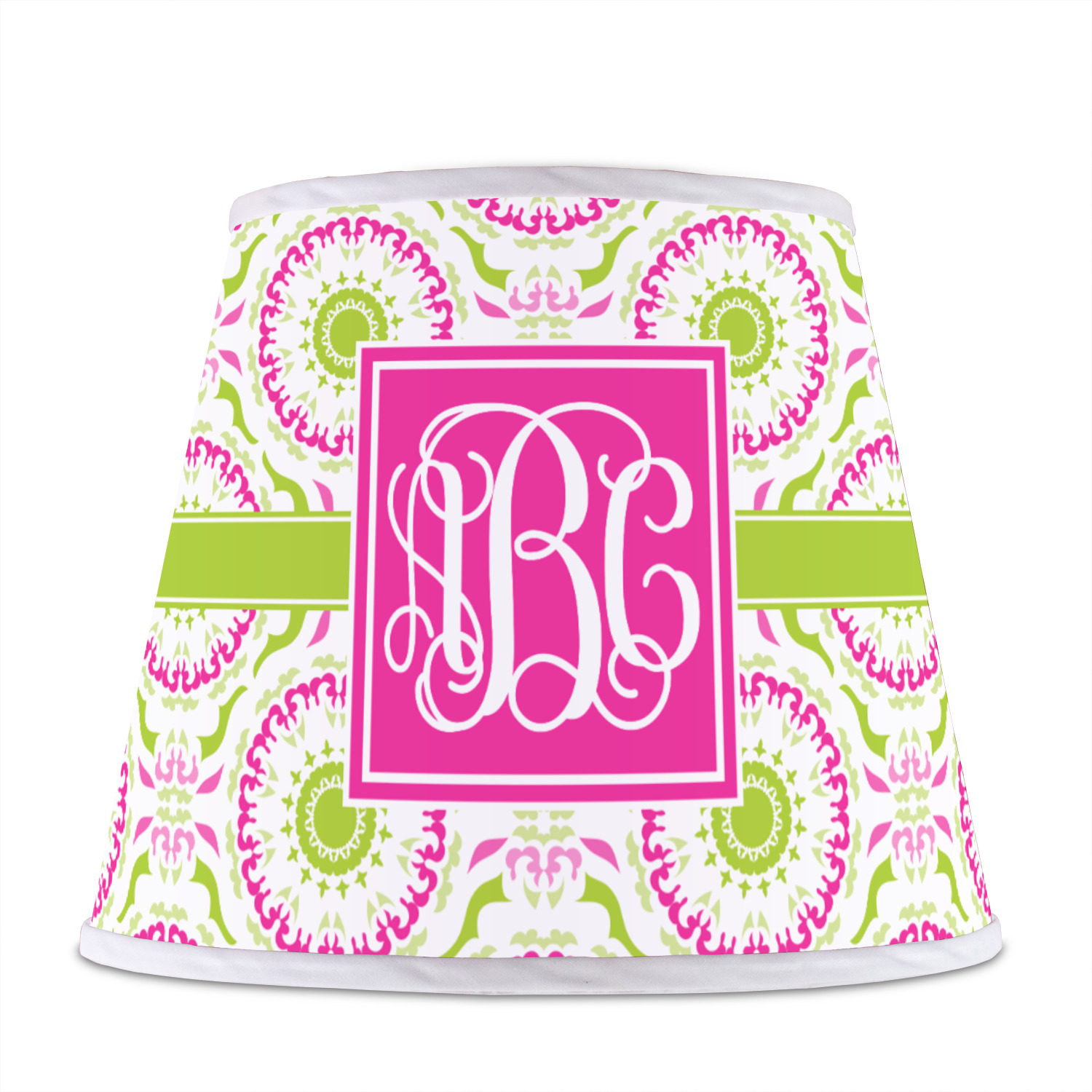 This design has a beautiful suzani floral pattern for the background. The colors in the background are white, hot pink, and lime green. These colors look super cute together. There is a lime green ribbon with a hot pink frame on top. Inside the frame is where your personalization goes. Put text or your initials for a monogram.
