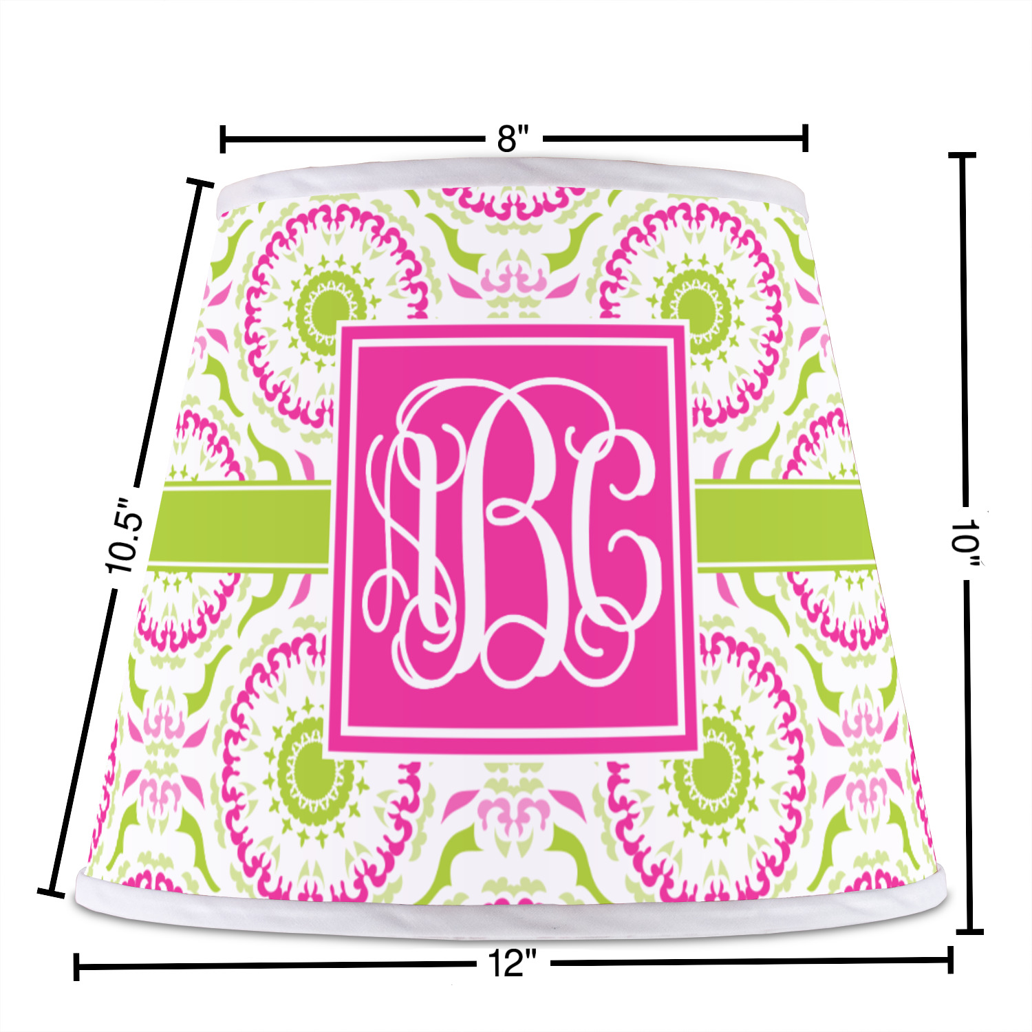 The base of this lampshade is 12 inches in diameter, and the top spans 8 inches in diameter. The total height of the lampshade is 10 inches. The angled nature of this custom lampshade concentrates the light, making it ideal for smaller spaces. This lampshade is made of matte, polyfilm, and displays your customization in its middle. The top and bottom of this colorful lamp shade are lined with a white fabric ribbon (which can be replaced with black inside the design studio) which frames your design and creates a sophisticated finish. As an UNO fitter lampshade, this unique lamp shade will fit a variety of bases.