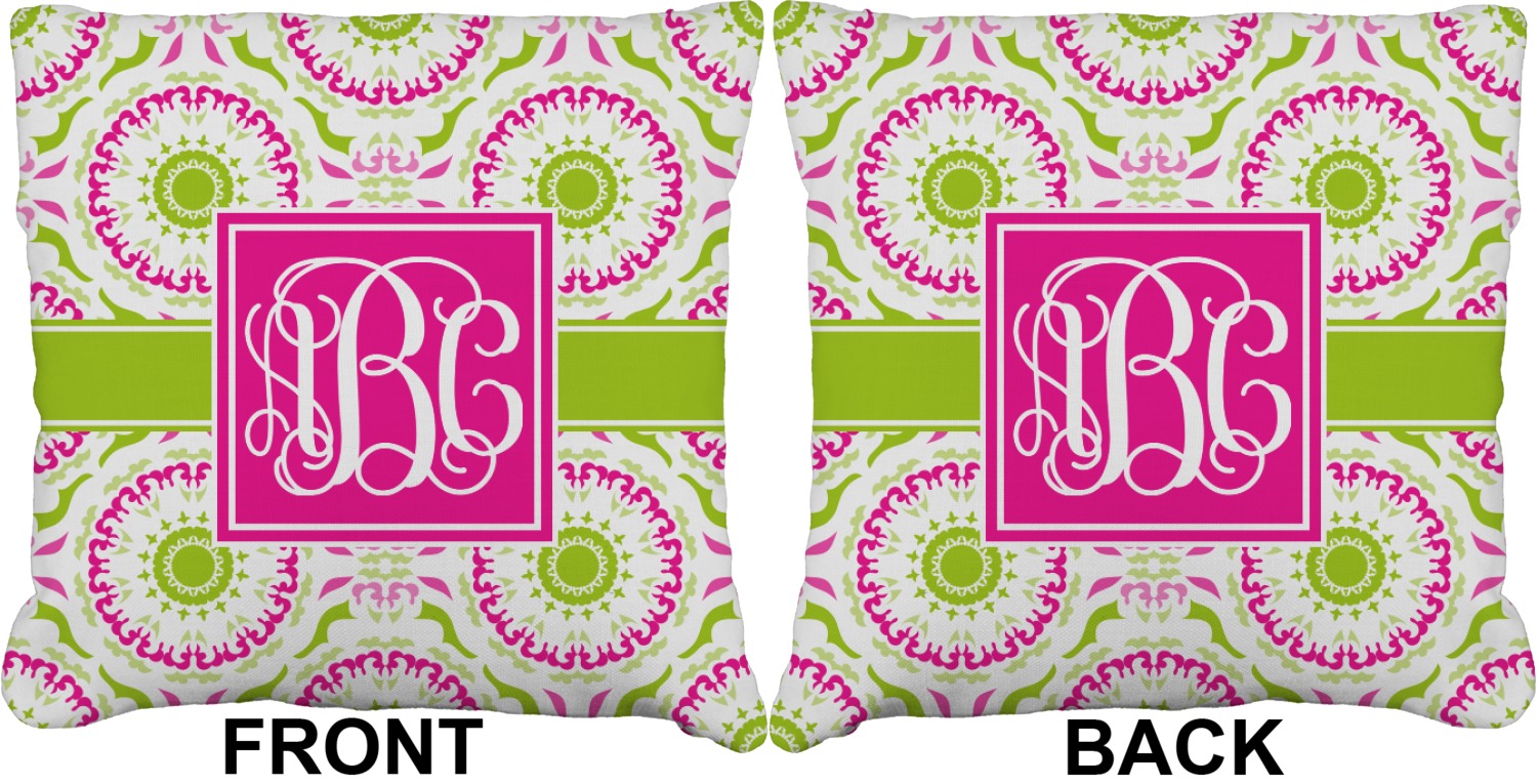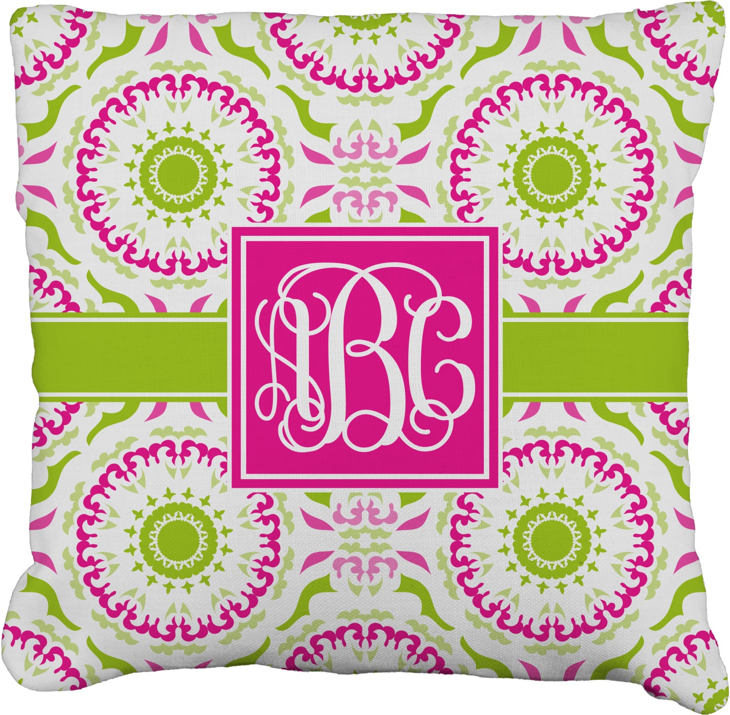 This design has a beautiful suzani floral pattern for the background. The colors in the background are white, hot pink, and lime green. These colors look super cute together. There is a lime green ribbon with a hot pink frame on top. Inside the frame is where your personalization goes. Put text or your initials for a monogram.