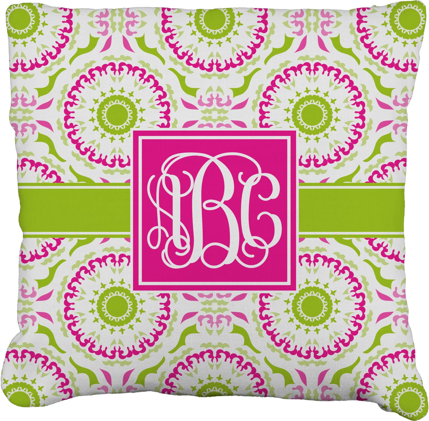 This design has a beautiful suzani floral pattern for the background. The colors in the background are white, hot pink, and lime green. These colors look super cute together. There is a lime green ribbon with a hot pink frame on top. Inside the frame is where your personalization goes. Put text or your initials for a monogram.