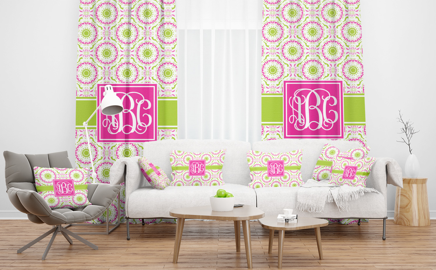 This design has a beautiful suzani floral pattern for the background. The colors in the background are white, hot pink, and lime green. These colors look super cute together. There is a lime green ribbon with a hot pink frame on top. Inside the frame is where your personalization goes. Put text or your initials for a monogram.