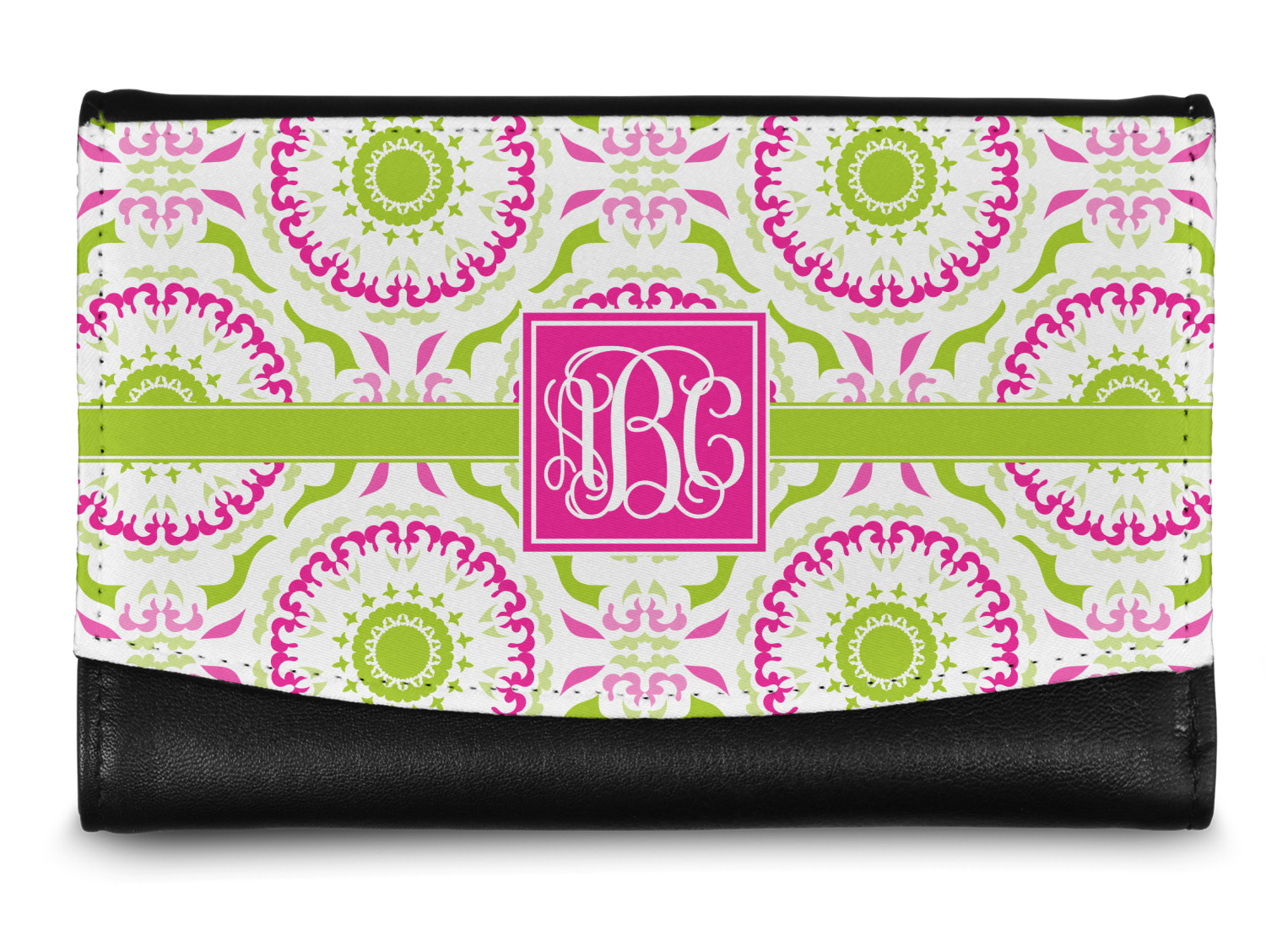 This design has a beautiful suzani floral pattern for the background. The colors in the background are white, hot pink, and lime green. These colors look super cute together. There is a lime green ribbon with a hot pink frame on top. Inside the frame is where your personalization goes. Put text or your initials for a monogram.