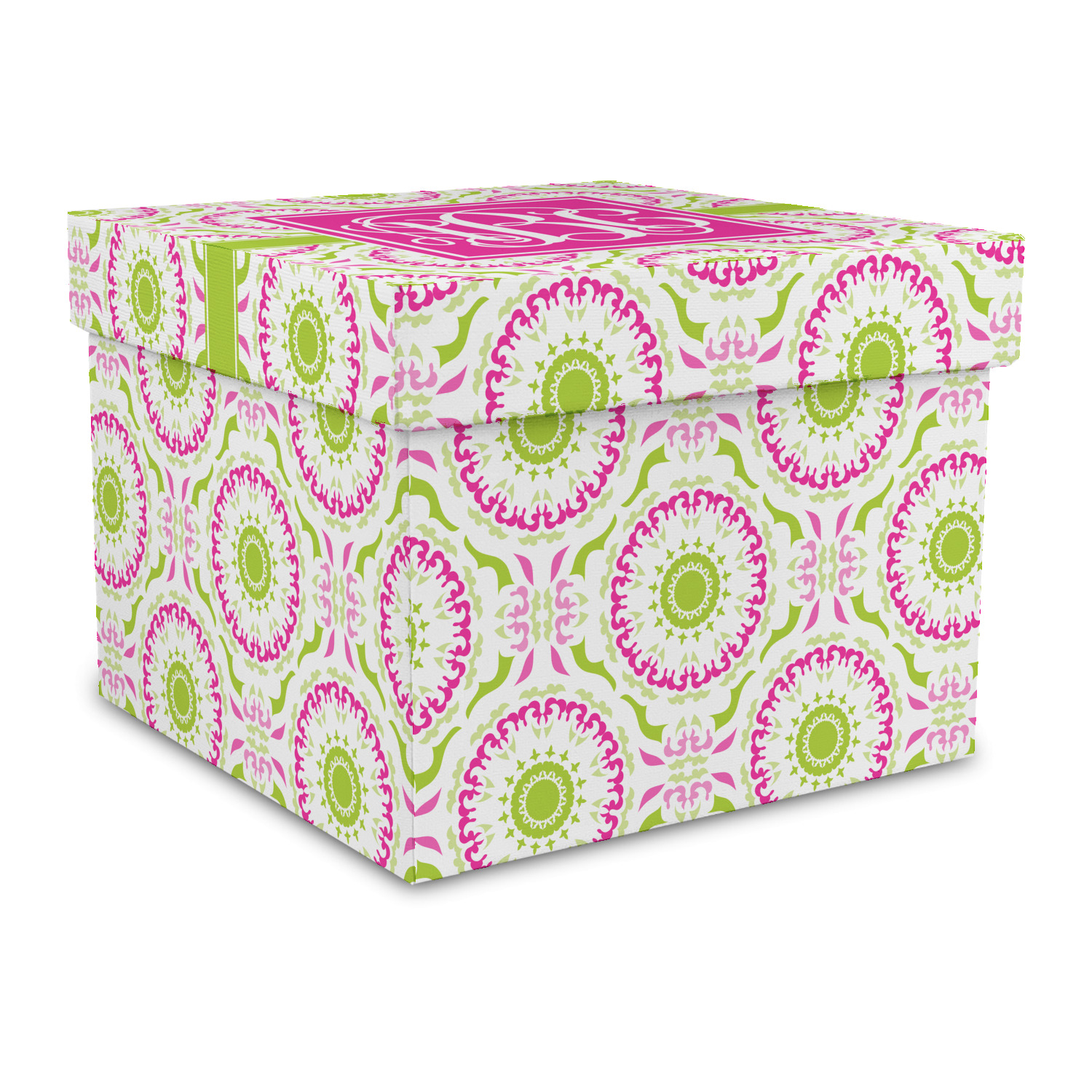 This design has a beautiful suzani floral pattern for the background. The colors in the background are white, hot pink, and lime green. These colors look super cute together. There is a lime green ribbon with a hot pink frame on top. Inside the frame is where your personalization goes. Put text or your initials for a monogram.