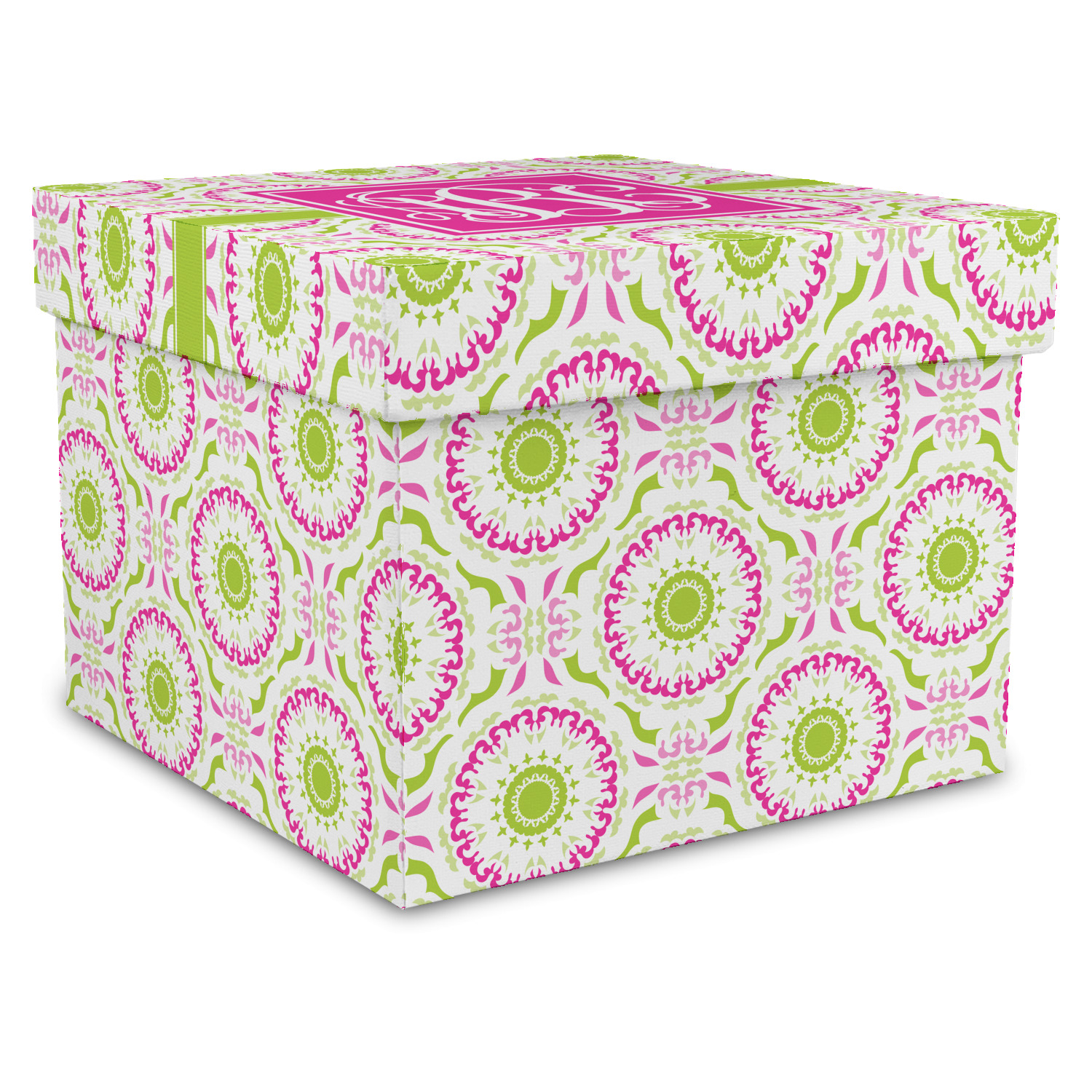 This design has a beautiful suzani floral pattern for the background. The colors in the background are white, hot pink, and lime green. These colors look super cute together. There is a lime green ribbon with a hot pink frame on top. Inside the frame is where your personalization goes. Put text or your initials for a monogram.