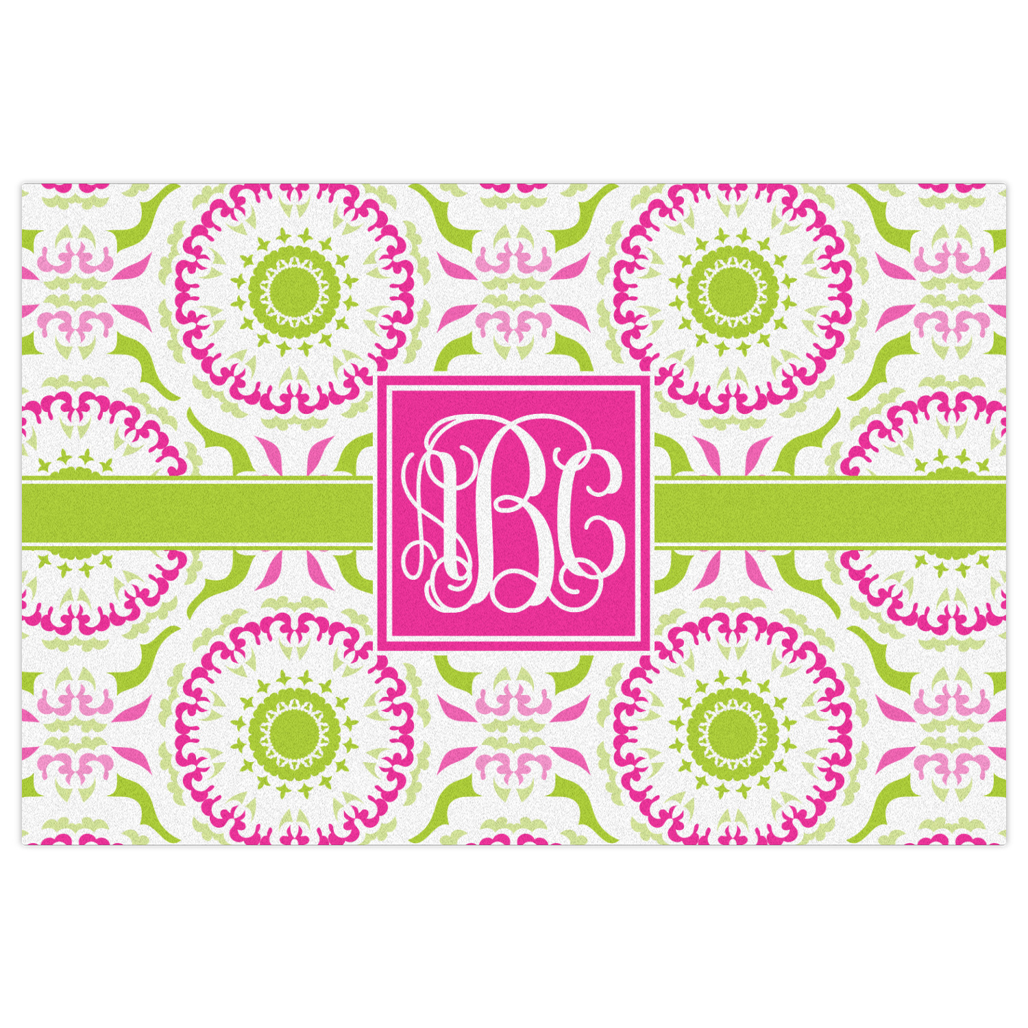 This design has a beautiful suzani floral pattern for the background. The colors in the background are white, hot pink, and lime green. These colors look super cute together. There is a lime green ribbon with a hot pink frame on top. Inside the frame is where your personalization goes. Put text or your initials for a monogram.