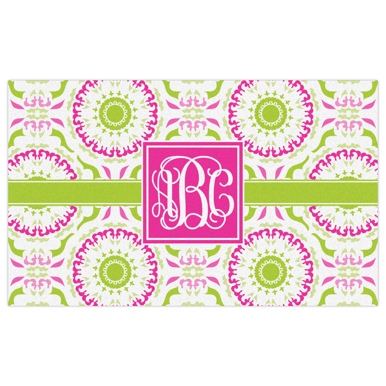 This design has a beautiful suzani floral pattern for the background. The colors in the background are white, hot pink, and lime green. These colors look super cute together. There is a lime green ribbon with a hot pink frame on top. Inside the frame is where your personalization goes. Put text or your initials for a monogram.