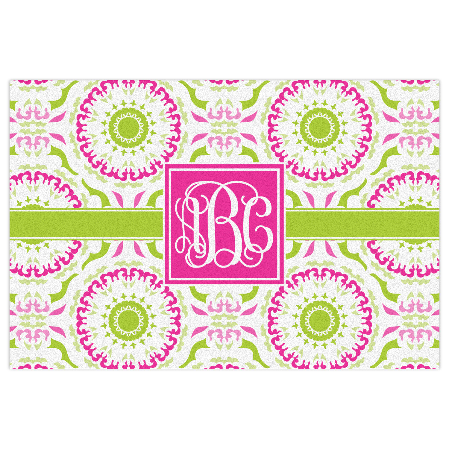 This design has a beautiful suzani floral pattern for the background. The colors in the background are white, hot pink, and lime green. These colors look super cute together. There is a lime green ribbon with a hot pink frame on top. Inside the frame is where your personalization goes. Put text or your initials for a monogram.