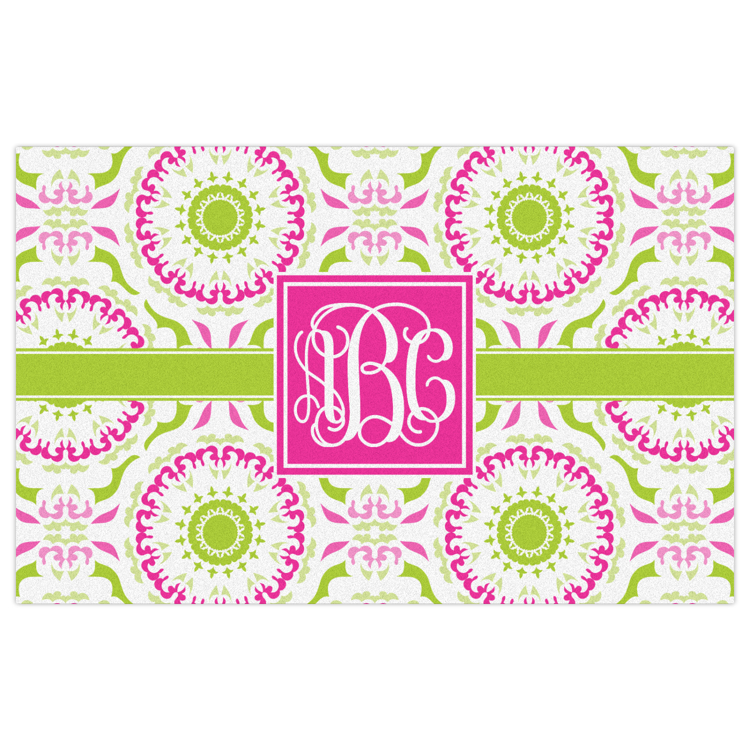 This design has a beautiful suzani floral pattern for the background. The colors in the background are white, hot pink, and lime green. These colors look super cute together. There is a lime green ribbon with a hot pink frame on top. Inside the frame is where your personalization goes. Put text or your initials for a monogram.