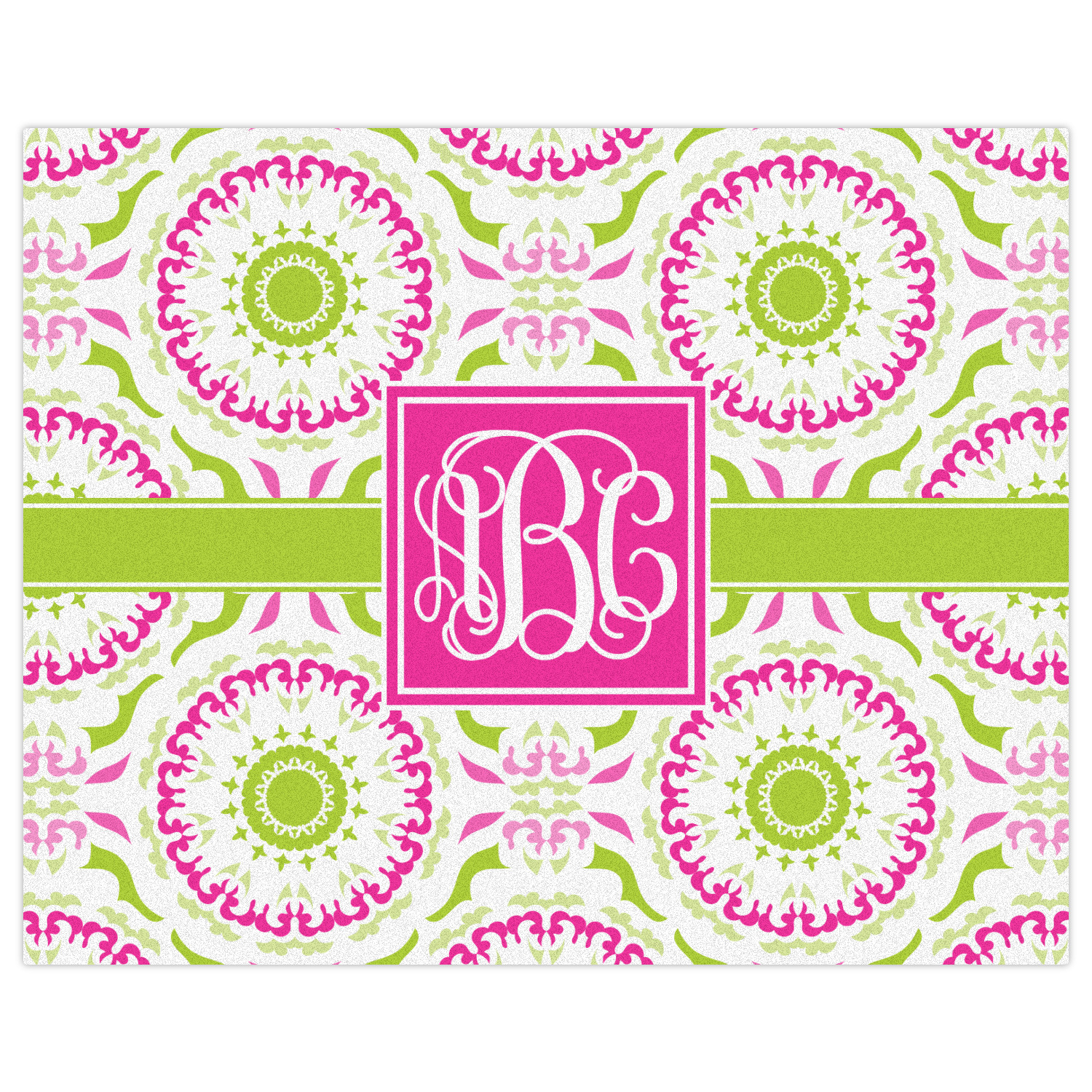 This design has a beautiful suzani floral pattern for the background. The colors in the background are white, hot pink, and lime green. These colors look super cute together. There is a lime green ribbon with a hot pink frame on top. Inside the frame is where your personalization goes. Put text or your initials for a monogram.