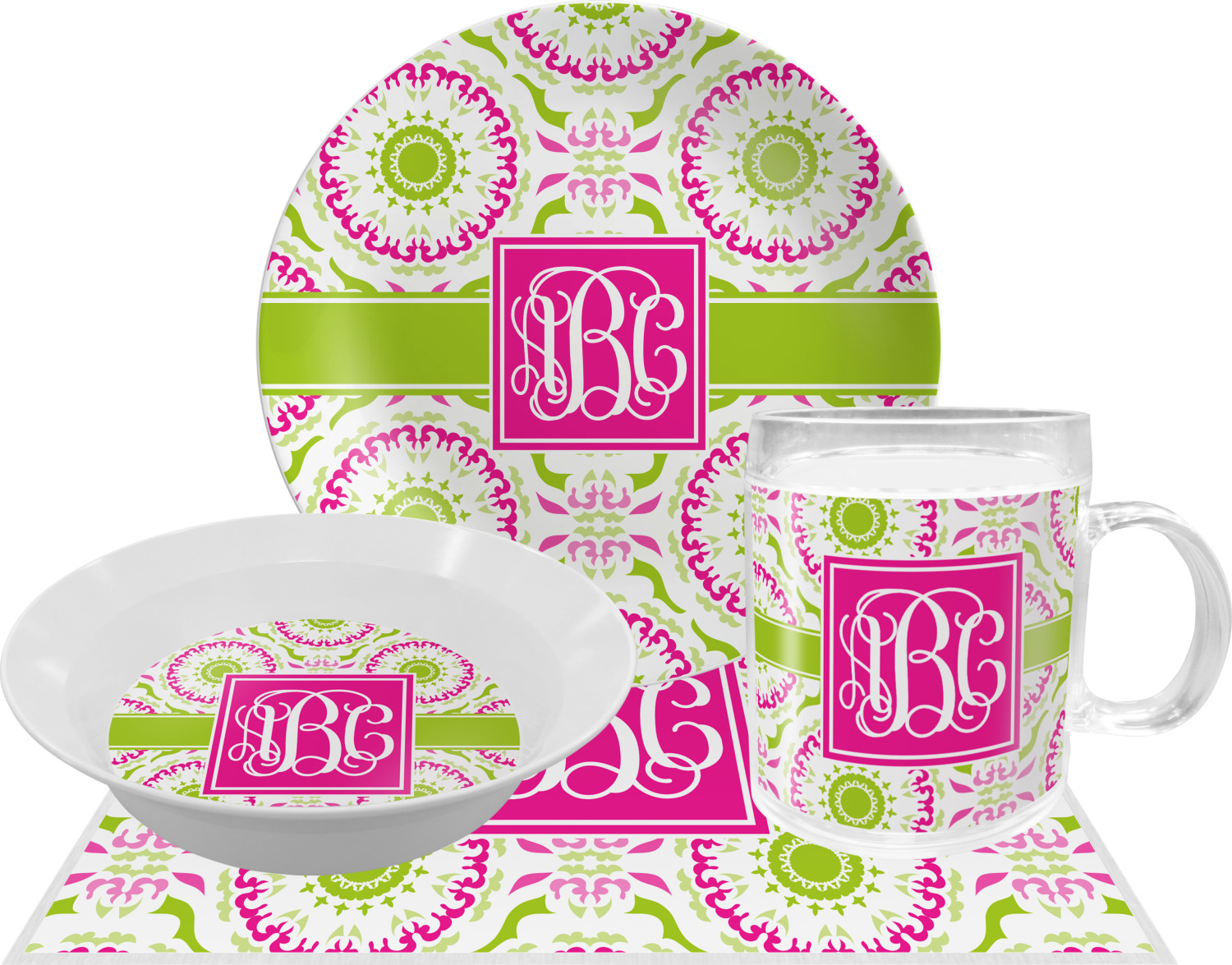 This design has a beautiful suzani floral pattern for the background. The colors in the background are white, hot pink, and lime green. These colors look super cute together. There is a lime green ribbon with a hot pink frame on top. Inside the frame is where your personalization goes. Put text or your initials for a monogram.