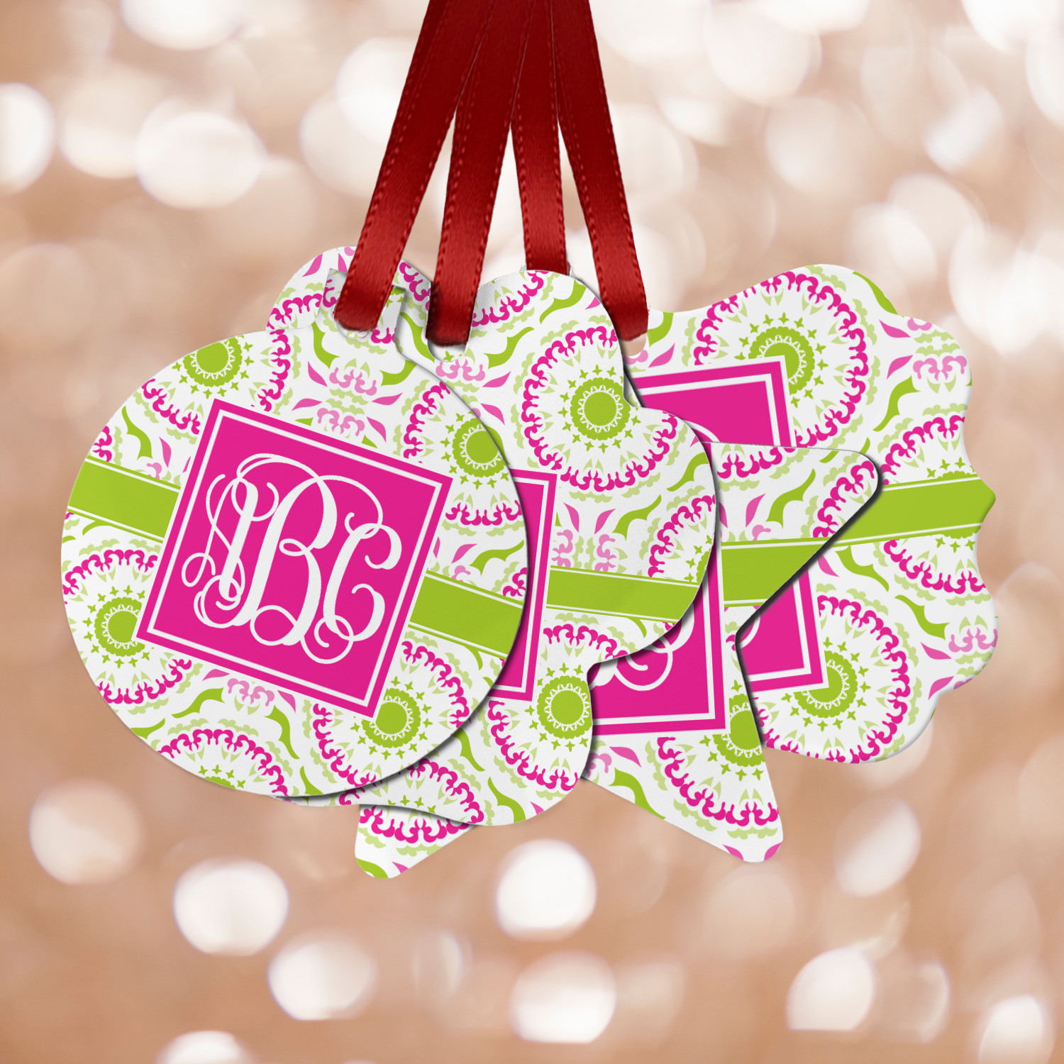 This design has a beautiful suzani floral pattern for the background. The colors in the background are white, hot pink, and lime green. These colors look super cute together. There is a lime green ribbon with a hot pink frame on top. Inside the frame is where your personalization goes. Put text or your initials for a monogram.
