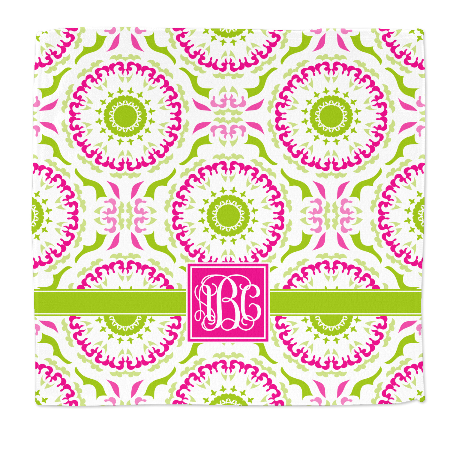 This design has a beautiful suzani floral pattern for the background. The colors in the background are white, hot pink, and lime green. These colors look super cute together. There is a lime green ribbon with a hot pink frame on top. Inside the frame is where your personalization goes. Put text or your initials for a monogram.