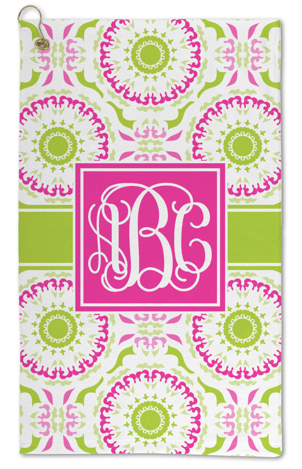 This design has a beautiful suzani floral pattern for the background. The colors in the background are white, hot pink, and lime green. These colors look super cute together. There is a lime green ribbon with a hot pink frame on top. Inside the frame is where your personalization goes. Put text or your initials for a monogram.