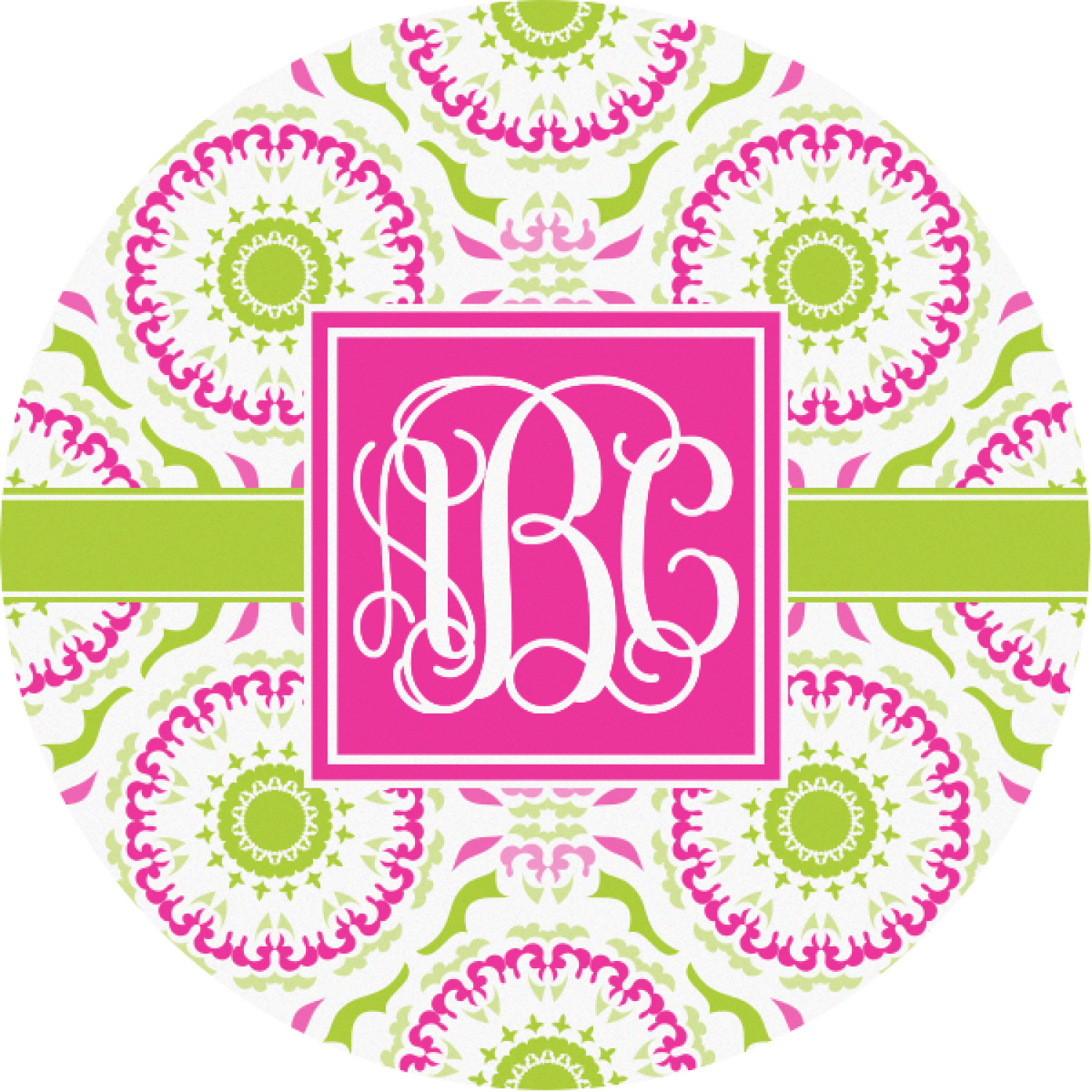 This design has a beautiful suzani floral pattern for the background. The colors in the background are white, hot pink, and lime green. These colors look super cute together. There is a lime green ribbon with a hot pink frame on top. Inside the frame is where your personalization goes. Put text or your initials for a monogram.