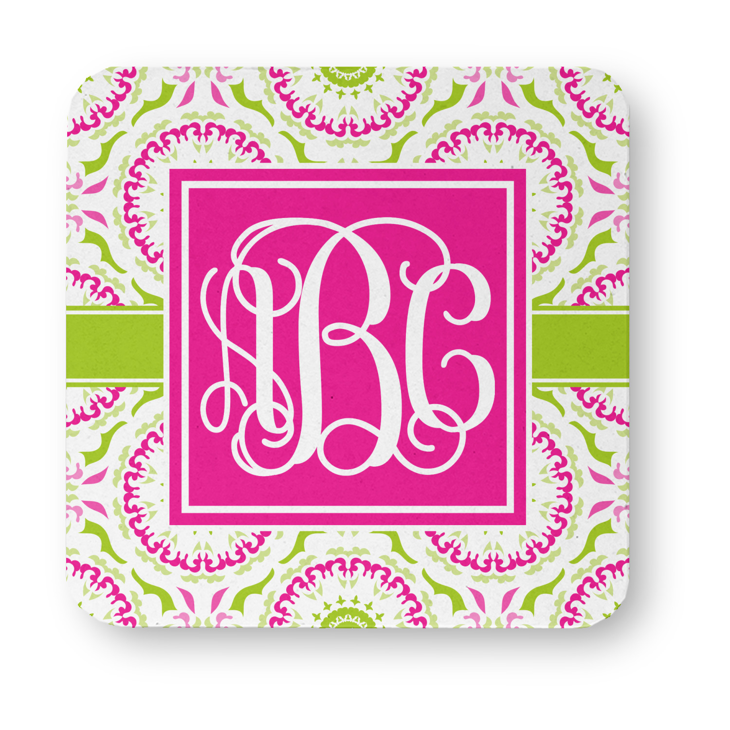 This design has a beautiful suzani floral pattern for the background. The colors in the background are white, hot pink, and lime green. These colors look super cute together. There is a lime green ribbon with a hot pink frame on top. Inside the frame is where your personalization goes. Put text or your initials for a monogram.