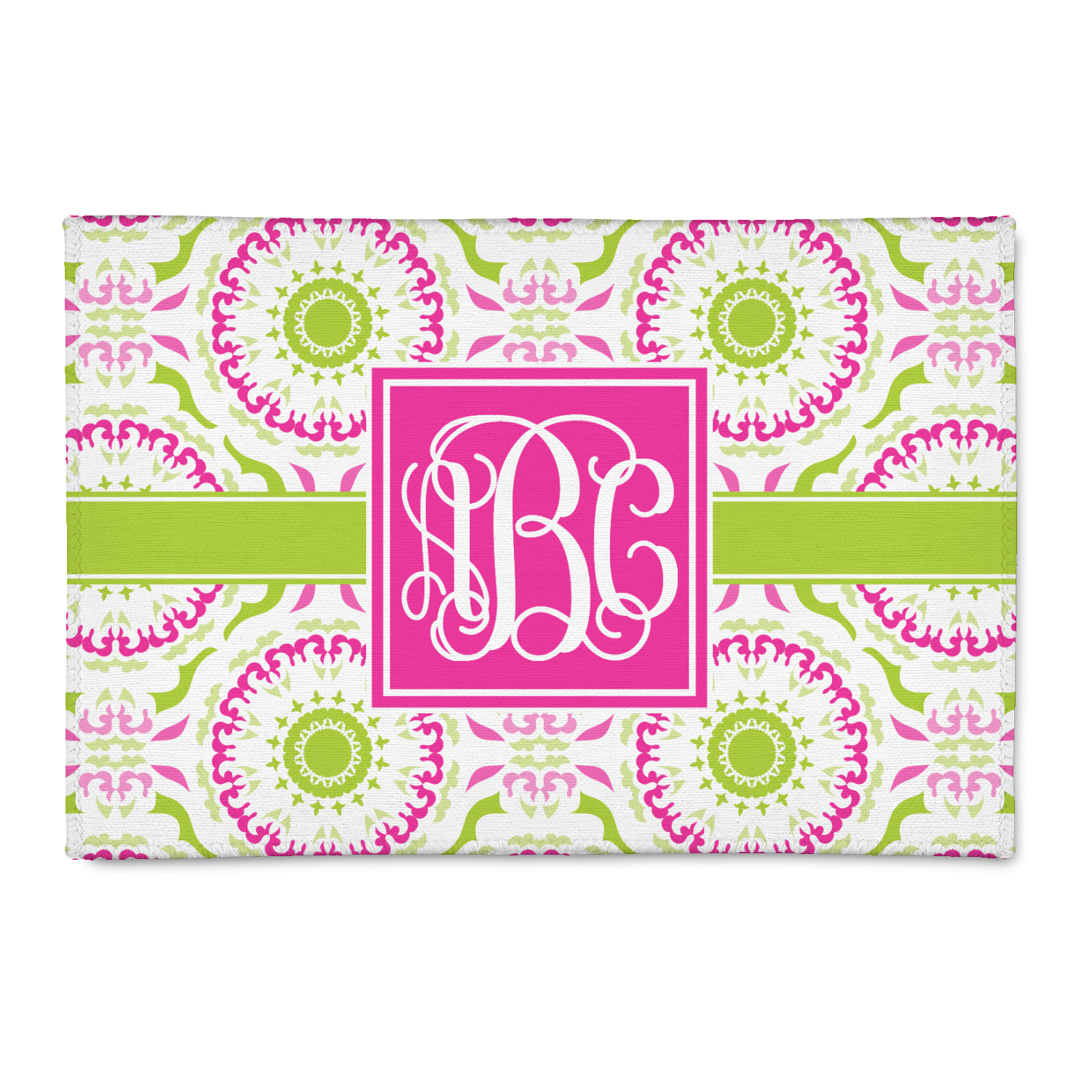 This design has a beautiful suzani floral pattern for the background. The colors in the background are white, hot pink, and lime green. These colors look super cute together. There is a lime green ribbon with a hot pink frame on top. Inside the frame is where your personalization goes. Put text or your initials for a monogram.