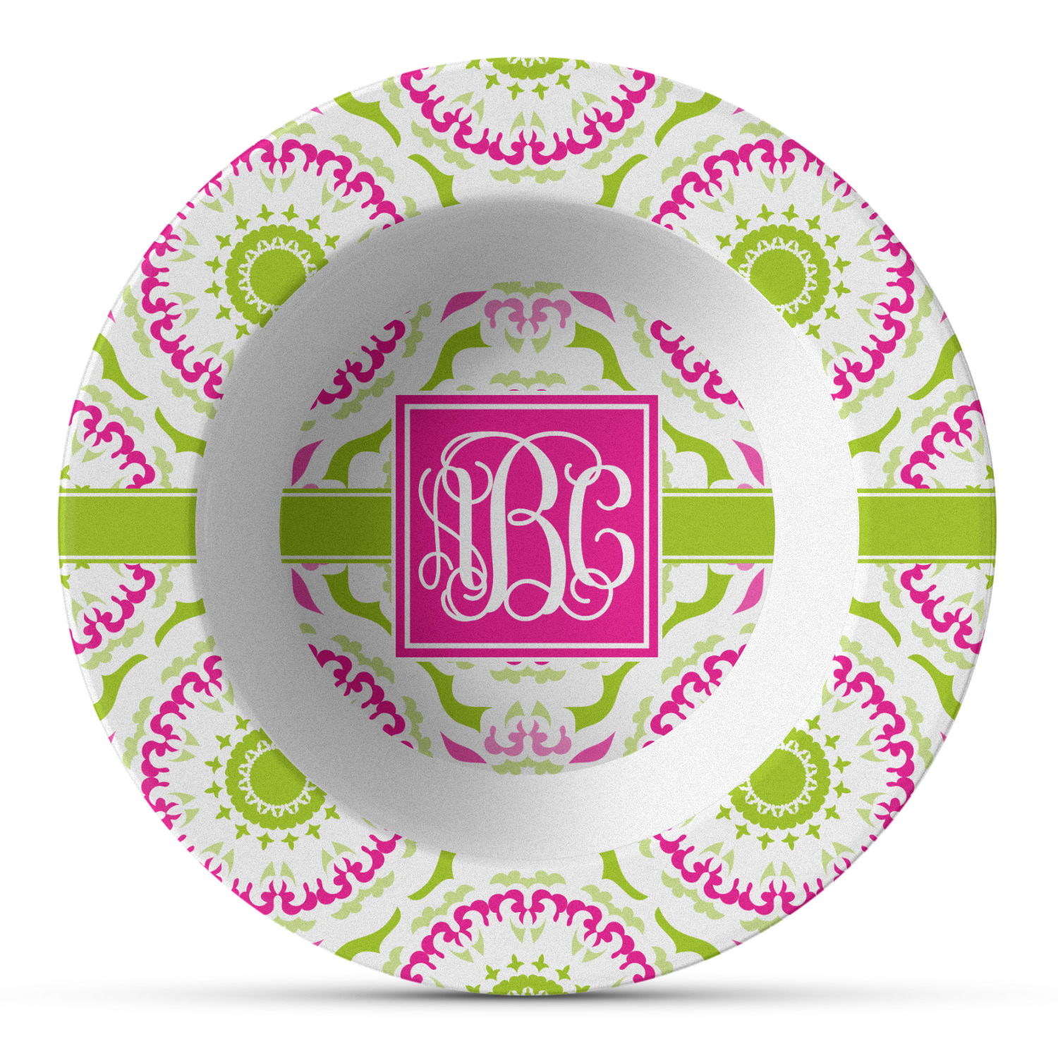 This design has a beautiful suzani floral pattern for the background. The colors in the background are white, hot pink, and lime green. These colors look super cute together. There is a lime green ribbon with a hot pink frame on top. Inside the frame is where your personalization goes. Put text or your initials for a monogram.