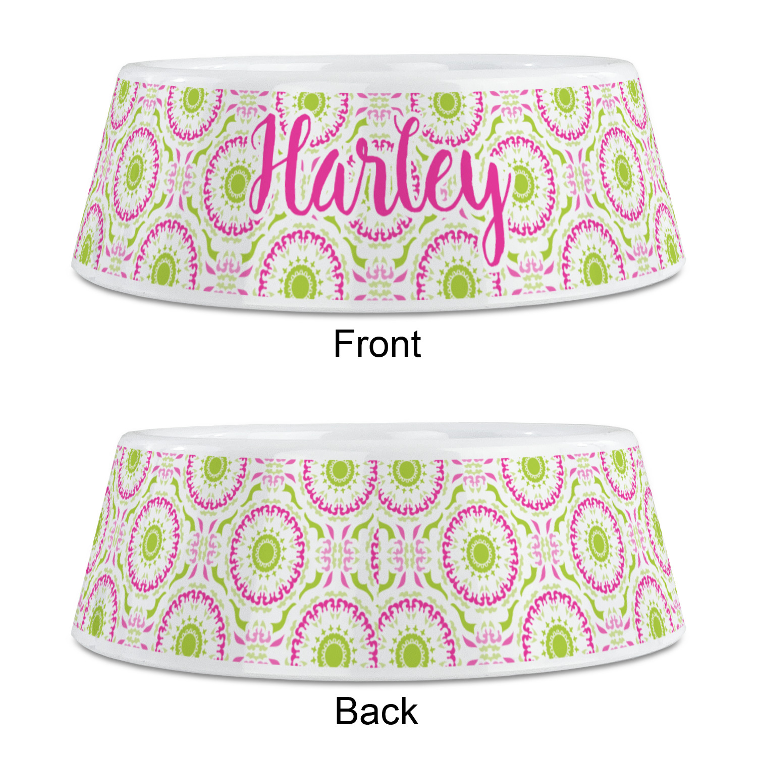 This design has a beautiful suzani floral pattern for the background. The colors in the background are white, hot pink, and lime green. These colors look super cute together. There is a lime green ribbon with a hot pink frame on top. Inside the frame is where your personalization goes. Put text or your initials for a monogram.