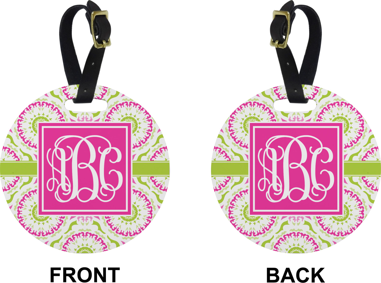 These personalized bag tags are sold in a variety of shapes, so that you may find the product that meets your vision exactly. We sell a round luggage tag, which measures at approximately 4" x 4". Our square luggage tag is about 3.5" x 3.5", while our rectangular version is 2.75" x 4 ".
