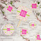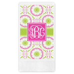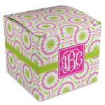 This design has a beautiful suzani floral pattern for the background. The colors in the background are white, hot pink, and lime green. These colors look super cute together. There is a lime green ribbon with a hot pink frame on top. Inside the frame is where your personalization goes. Put text or your initials for a monogram.