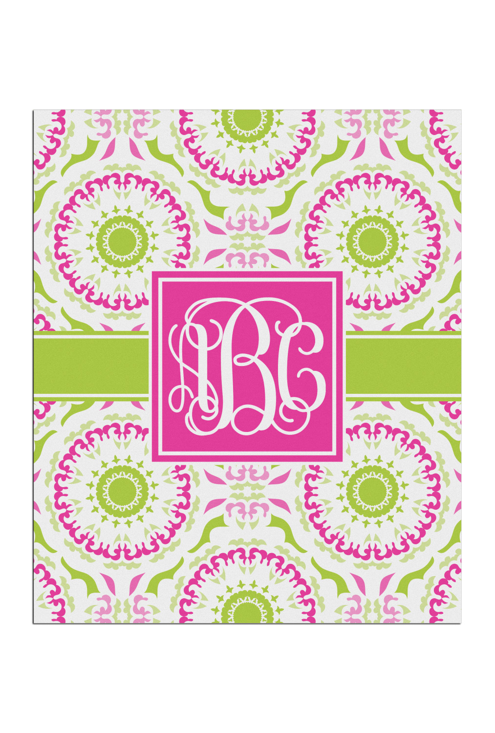 This design has a beautiful suzani floral pattern for the background. The colors in the background are white, hot pink, and lime green. These colors look super cute together. There is a lime green ribbon with a hot pink frame on top. Inside the frame is where your personalization goes. Put text or your initials for a monogram.