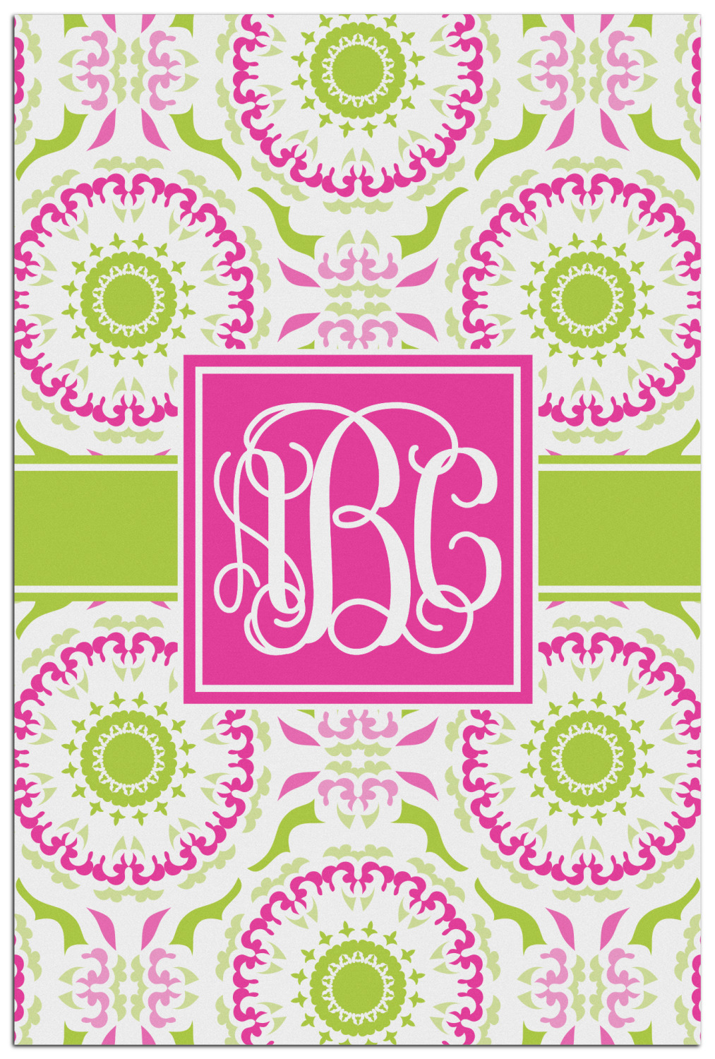 This design has a beautiful suzani floral pattern for the background. The colors in the background are white, hot pink, and lime green. These colors look super cute together. There is a lime green ribbon with a hot pink frame on top. Inside the frame is where your personalization goes. Put text or your initials for a monogram.