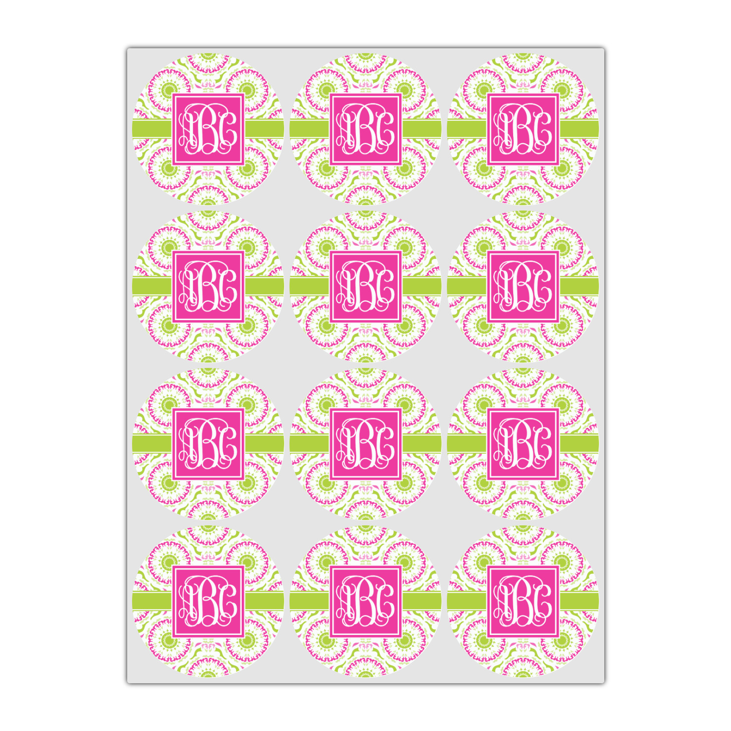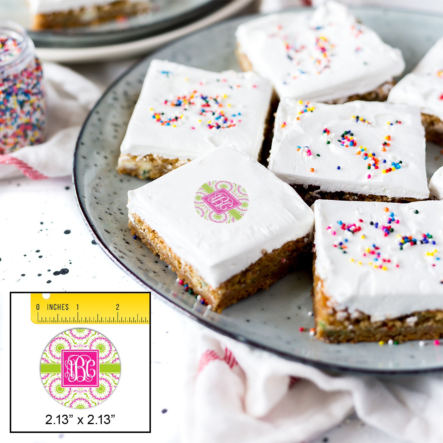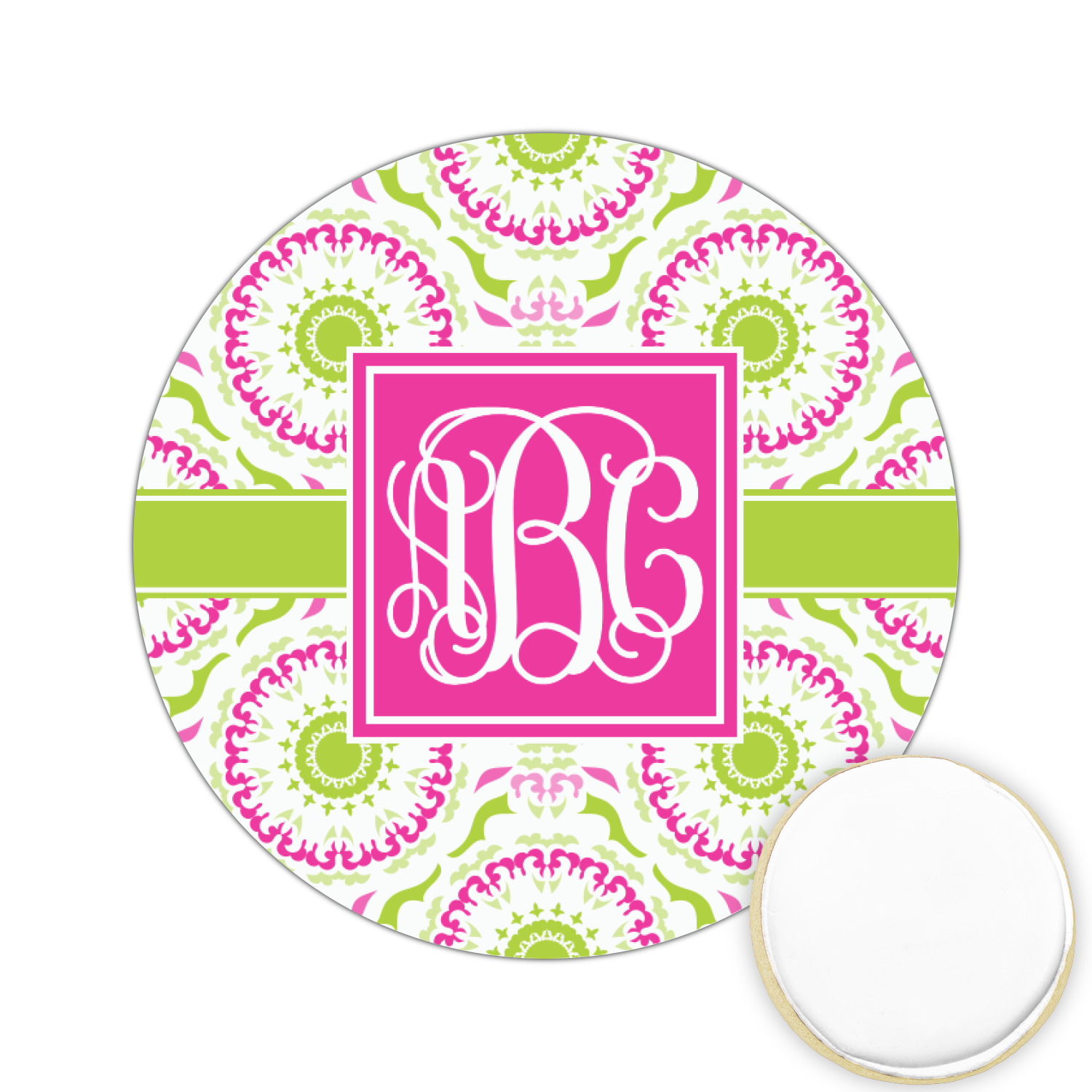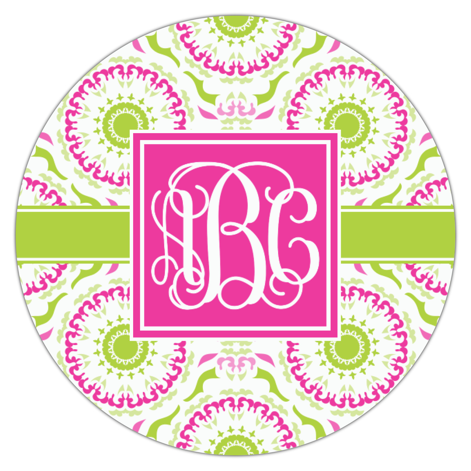 This design has a beautiful suzani floral pattern for the background. The colors in the background are white, hot pink, and lime green. These colors look super cute together. There is a lime green ribbon with a hot pink frame on top. Inside the frame is where your personalization goes. Put text or your initials for a monogram.