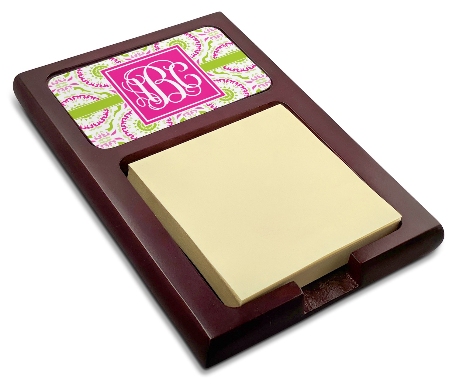 Crafted from a fine mahogany, this post it note holder is in the shade of a dark, cherry color. The dispenser itself is about 4.25 by 6.25 by 0.75 inches. You can place your 3 by 3 inch sticky notes in the indentation below the nameplate. We print your customization onto the nameplate that rests above the velvety indentation.