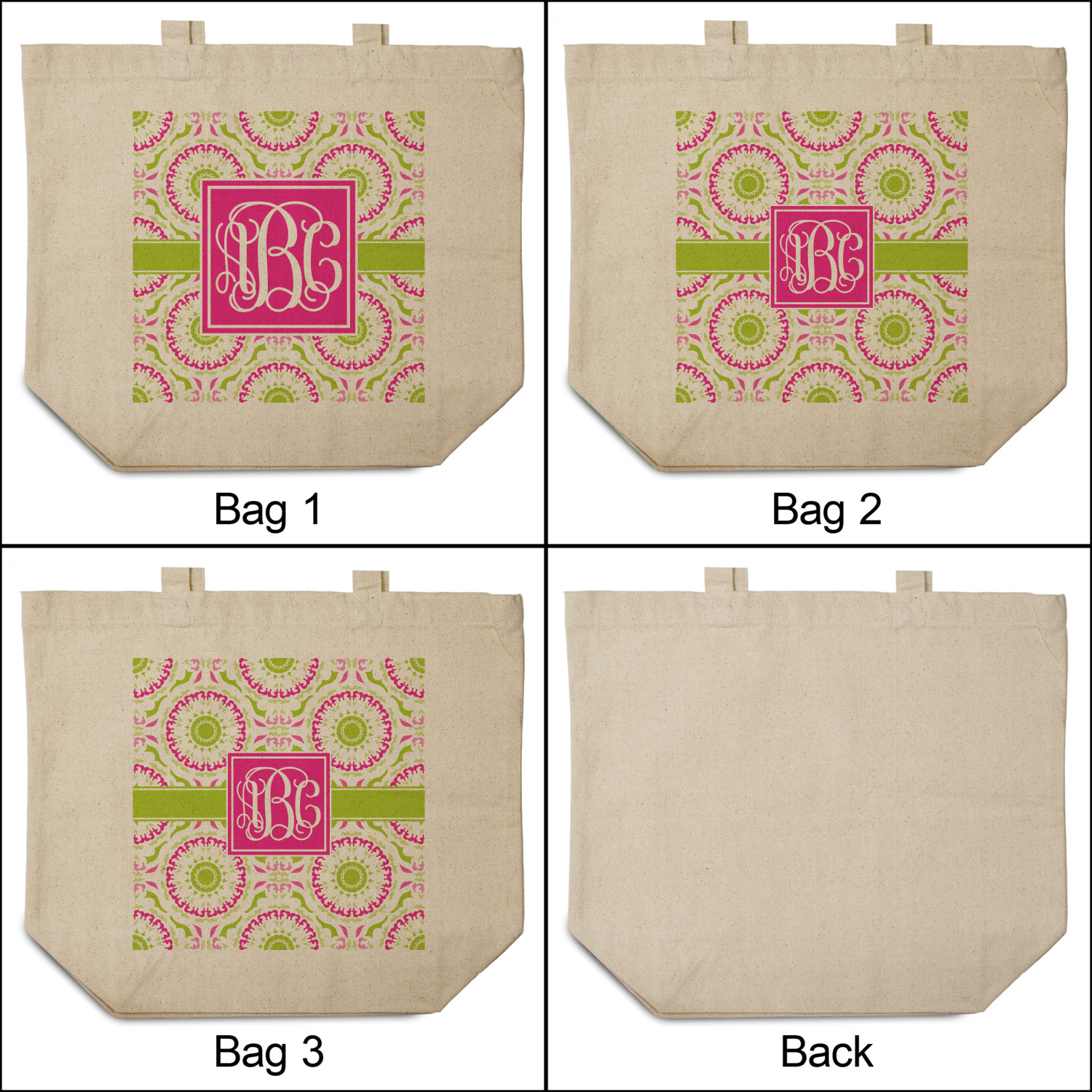 This design has a beautiful suzani floral pattern for the background. The colors in the background are white, hot pink, and lime green. These colors look super cute together. There is a lime green ribbon with a hot pink frame on top. Inside the frame is where your personalization goes. Put text or your initials for a monogram.