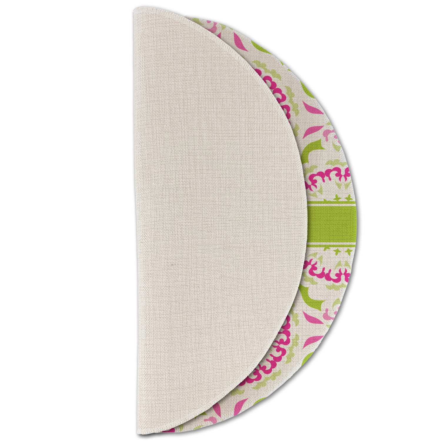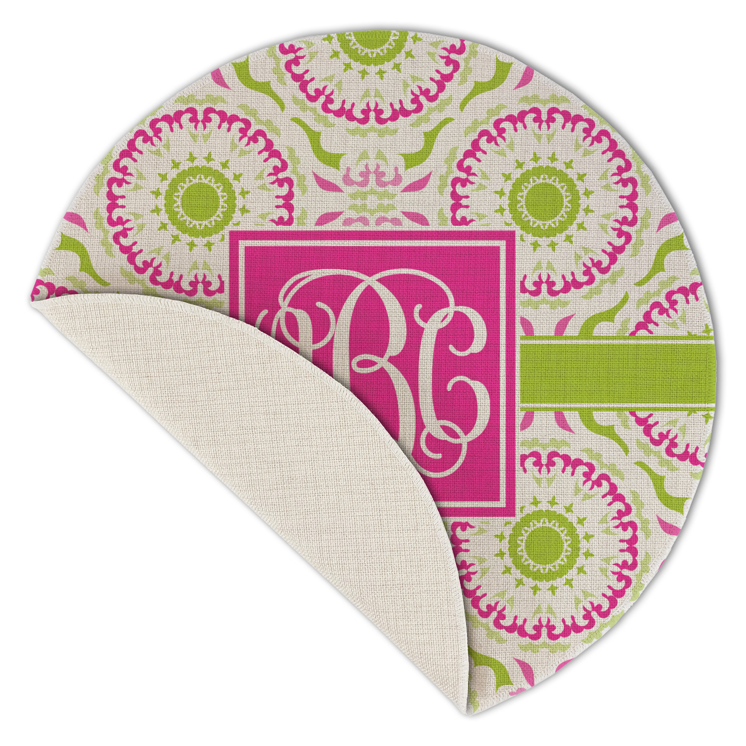 This design has a beautiful suzani floral pattern for the background. The colors in the background are white, hot pink, and lime green. These colors look super cute together. There is a lime green ribbon with a hot pink frame on top. Inside the frame is where your personalization goes. Put text or your initials for a monogram.